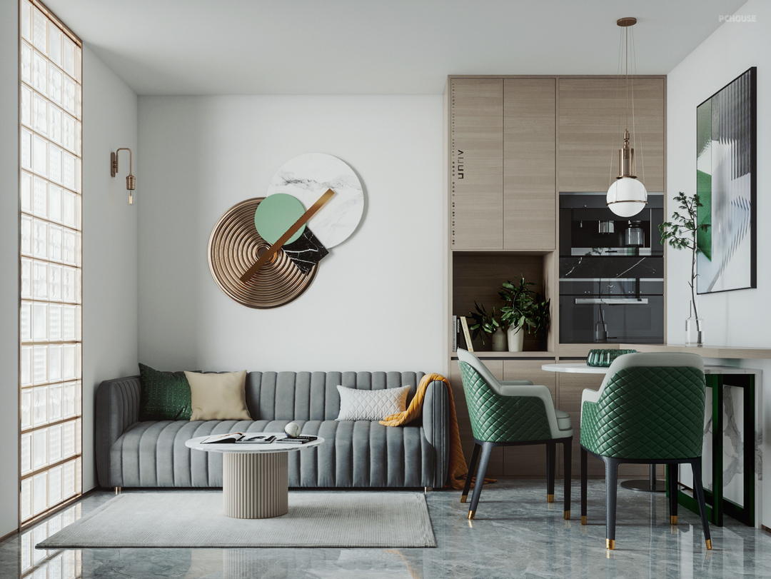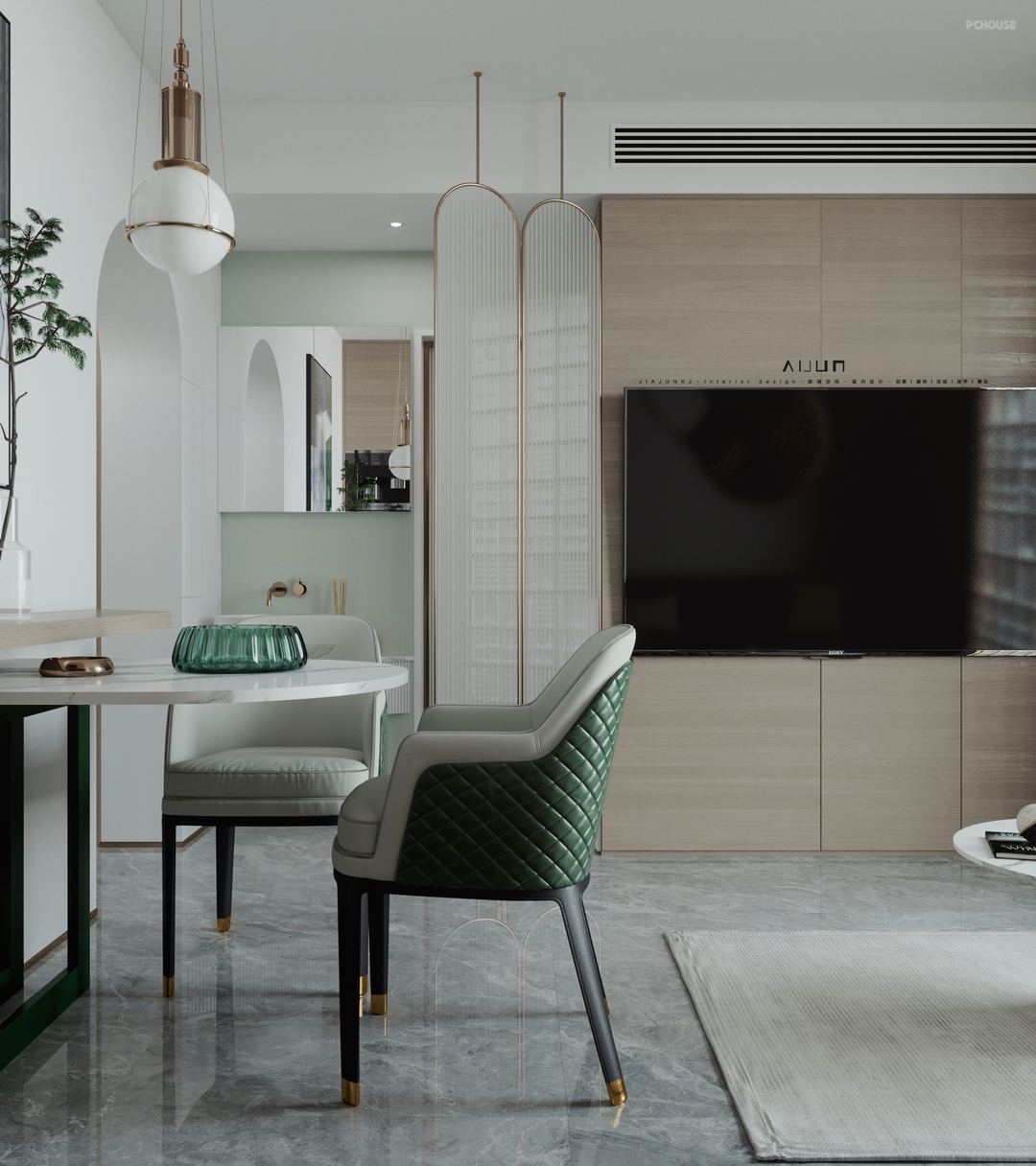 奢华的金色元素点缀在整屋设计中,墨绿色皮质餐椅、糖果盘则呼应了整体的灰棕绿色调,是客厅里即实用又极具质感的存在。