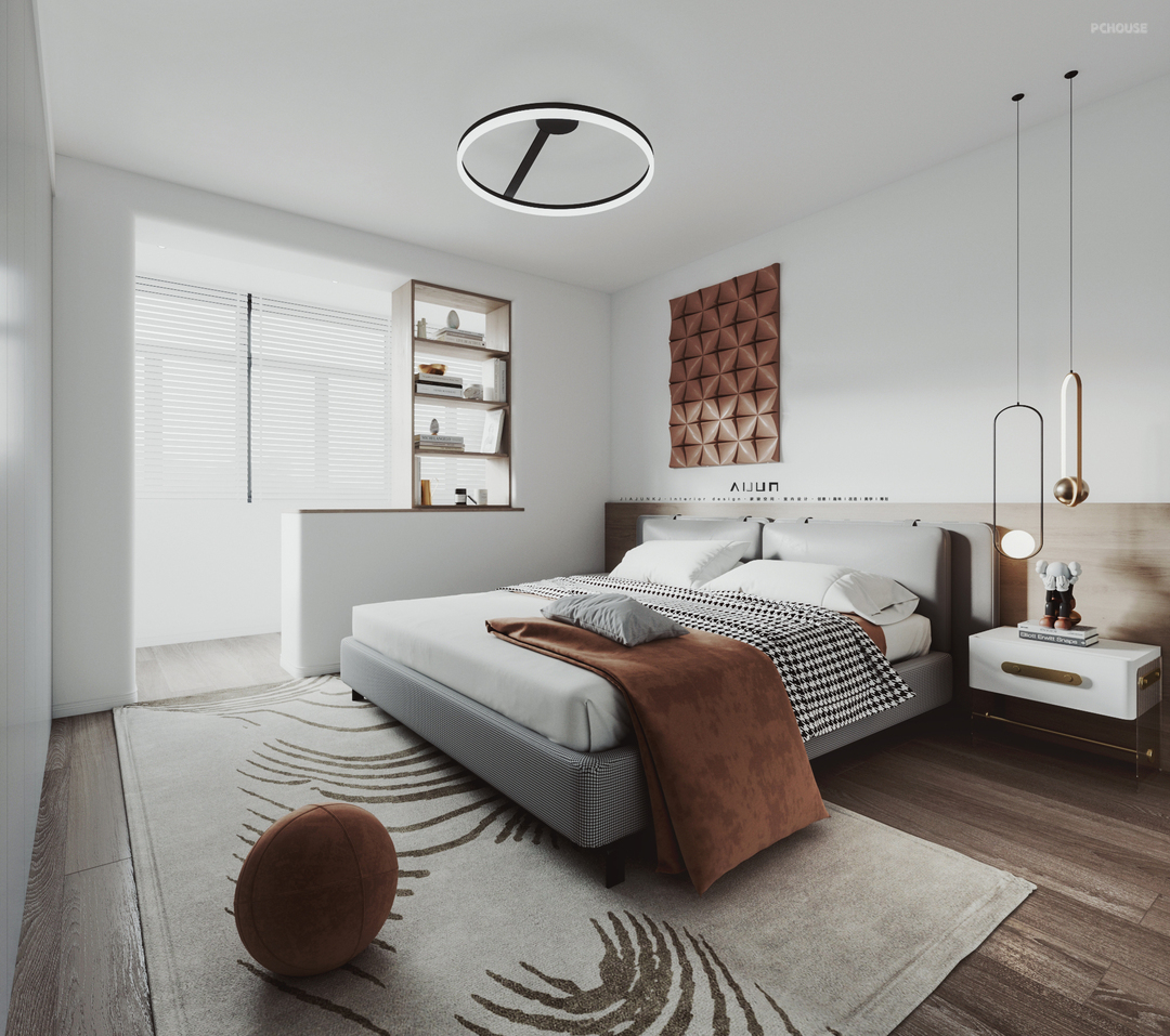 木地板上墙做床头背景。空间感延伸,墙上的棕色造型简单而又富于变化,为主卧增加了时尚感。