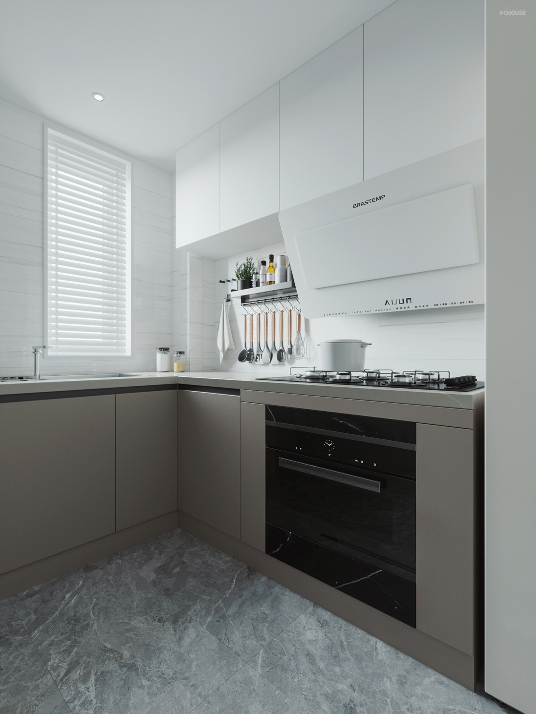 白色的吊柜、油烟机、百叶窗帘、长条墙砖让原本狭窄的厨房视觉宽敞,虽然墙上元素很多,经过颜色的统一,看起来也没有那么厚重了。