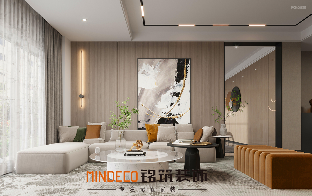 米色的布艺沙发搭配浅灰地毯,奠定了整个空间低调沉稳的气质感,沙发背景墙选用高端大气的木饰面材料,与沙发相得益彰。装饰画丰富了墙面却不显突兀感