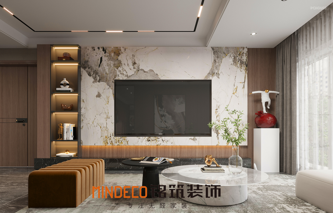 客厅中心,茶几大理石的底座,玻璃的台面,圆弧状的造型十分考究。电视背景墙白底花纹瓷砖,底部埋了灯线,泛着温润的光泽的一侧作为装饰区域,摆放了书籍和工艺品,整个客厅低调不失趣味,简洁不失温柔