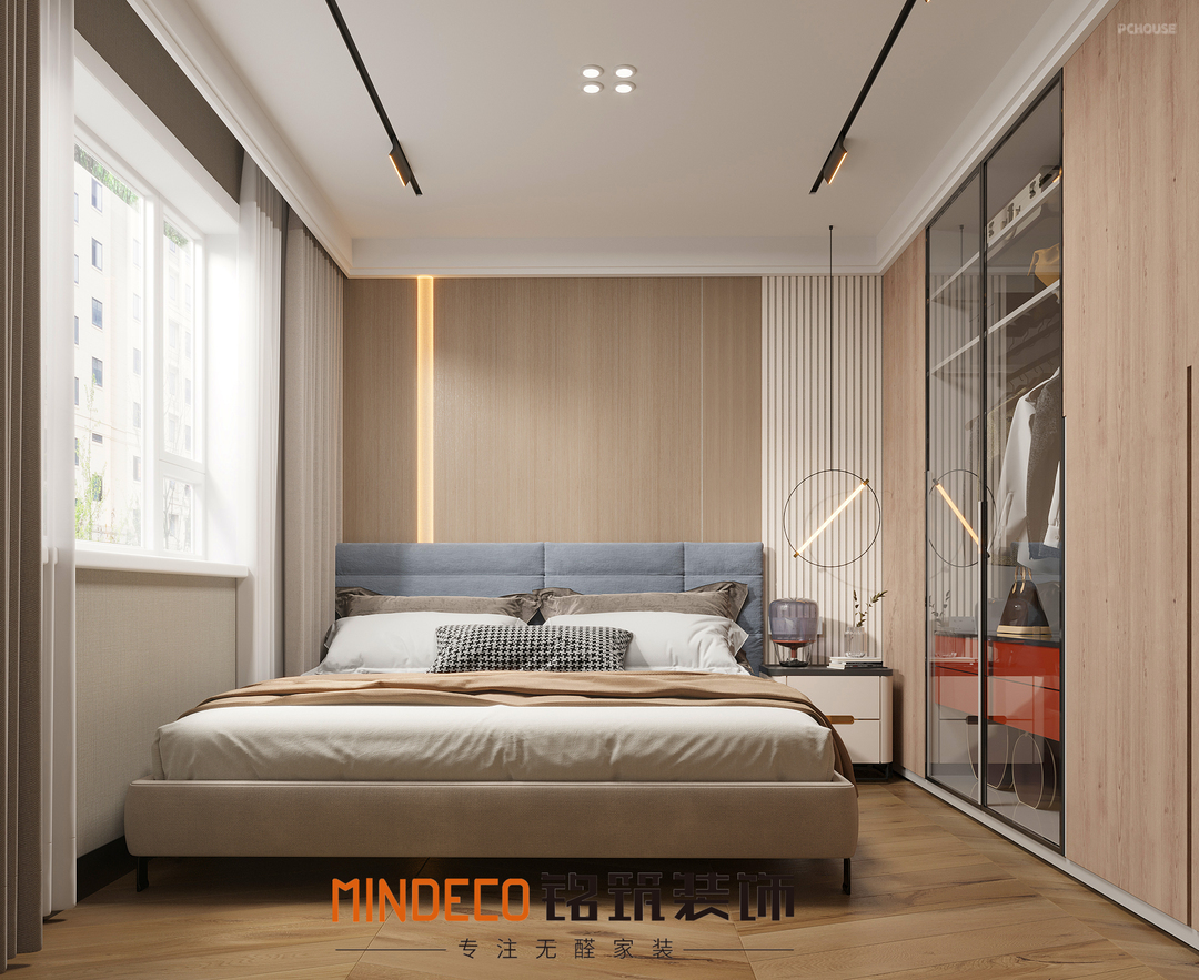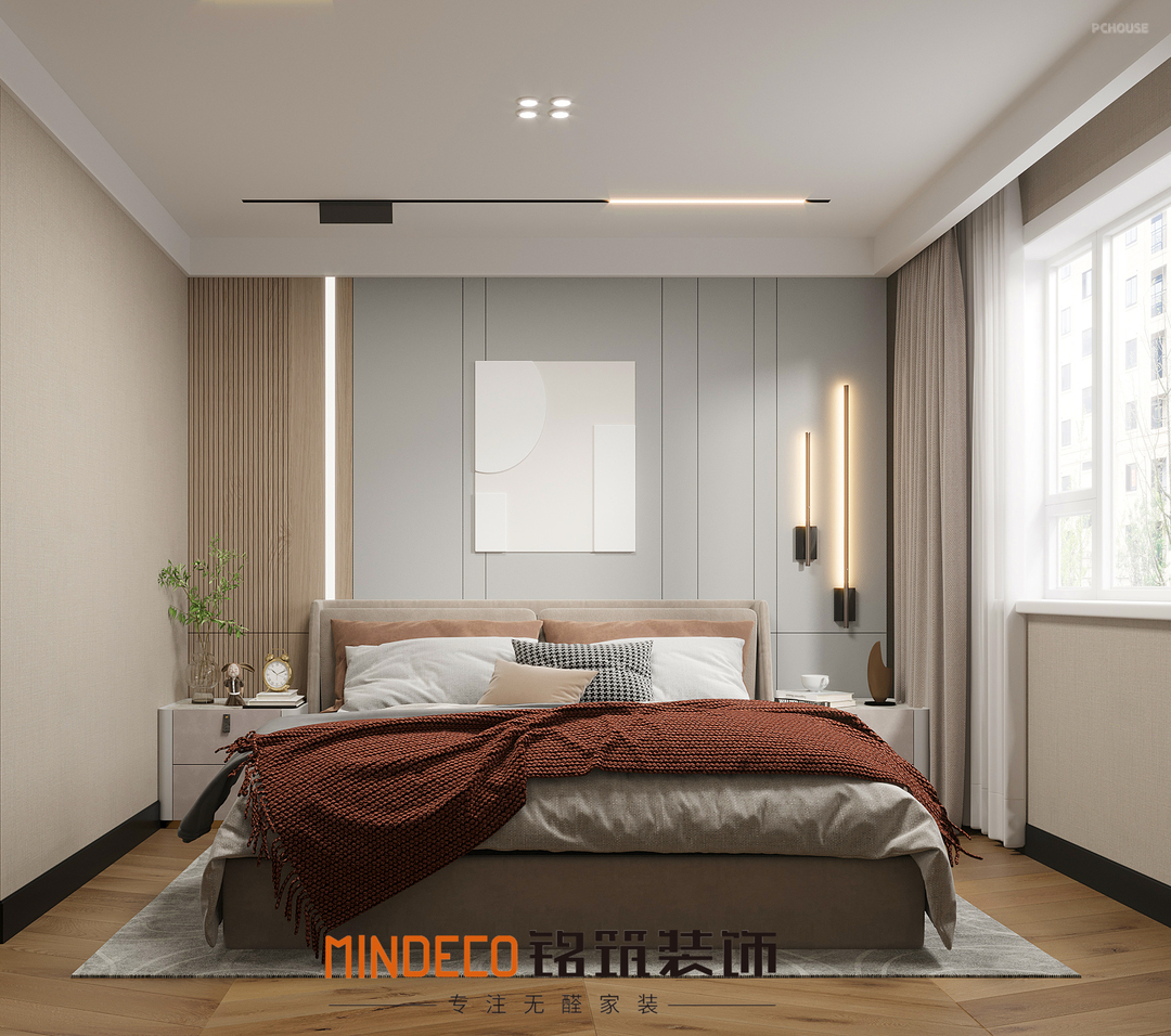 主卧空间十分宽敞。卧室铺设木纹地板,营造温暖的氛围。简洁的床具不多一丝缀余感,卧室同样采用无主灯设计,摒除压抑感。房间使用灰色窗帘色调契合,质感厚重,遮光性能强的明亮的落地窗,轻薄的白纱,清新的空气和暖暖的阳光。一切都是那么美好