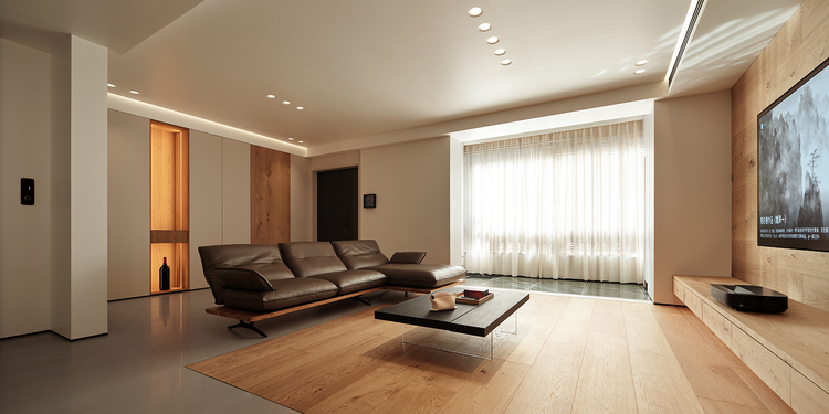 @合壹空间设计:一楼,起居生活区。现代风混搭原木,兼顾各个年龄层的喜好元素。