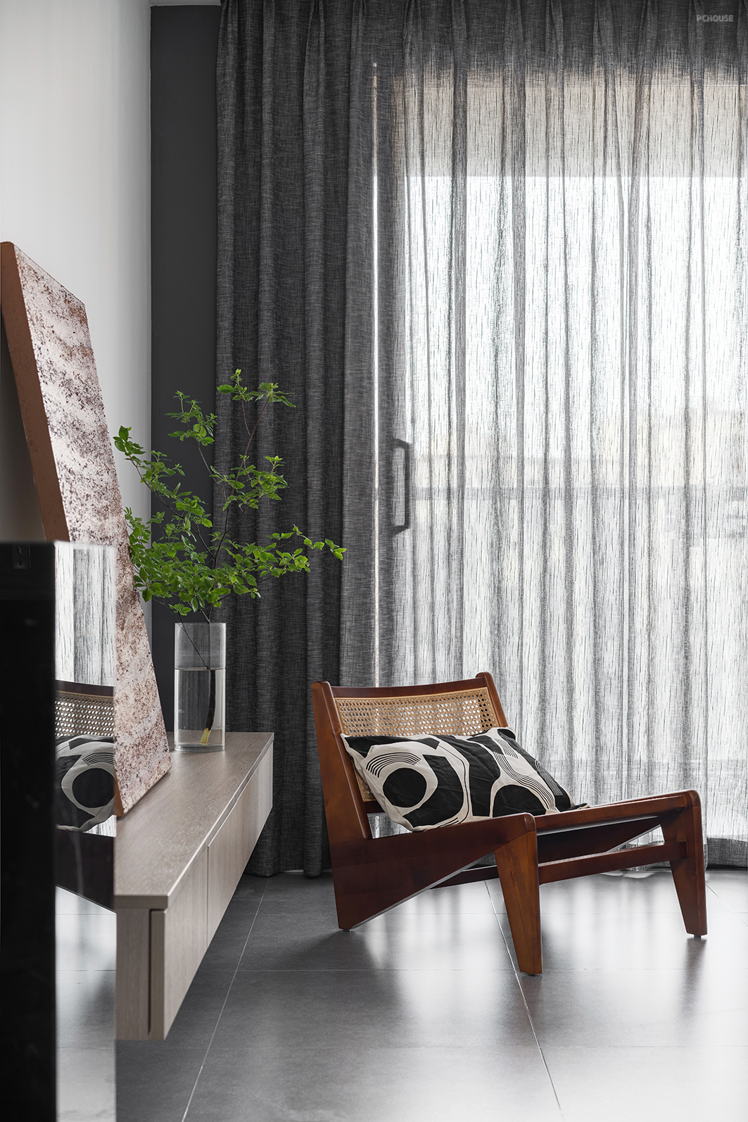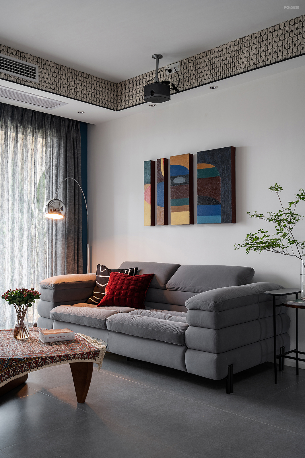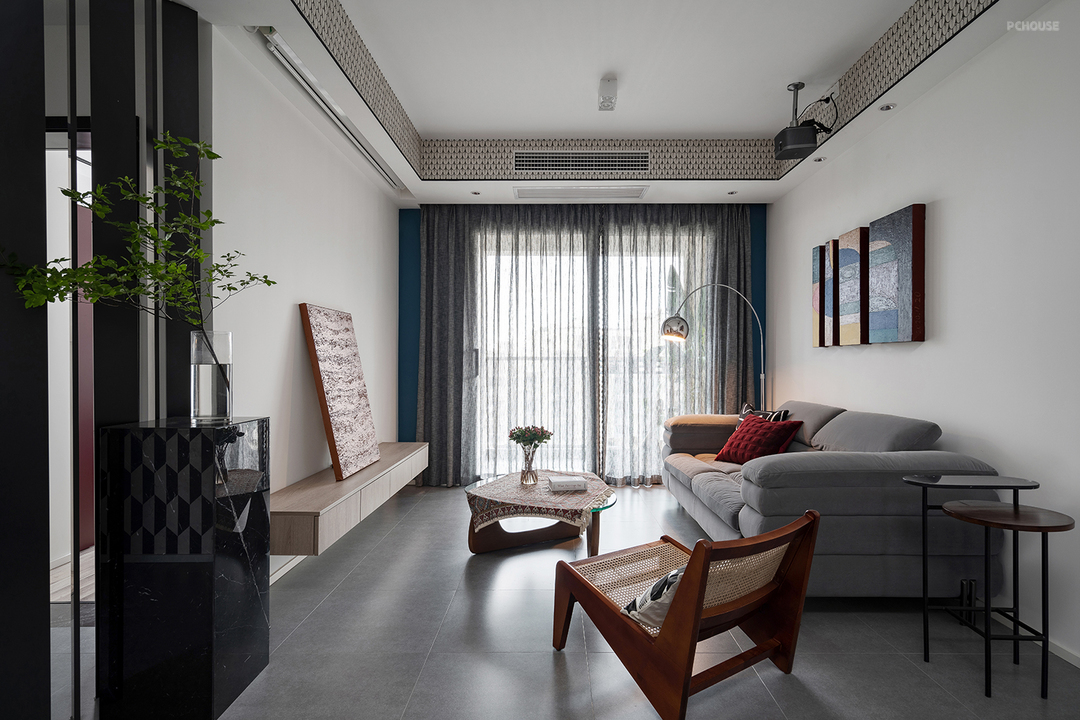 ▲业主平日休闲会躺在沙发上,喝点小酒,看综艺跟剧。客厅窗边暗藏蓝色乳胶漆(书房、客厅、主卧窗边均为蓝色乳胶漆)。吊顶边吊四周COLE&SON墙纸增添装饰感。深色纱帘,柔化屋内光线。