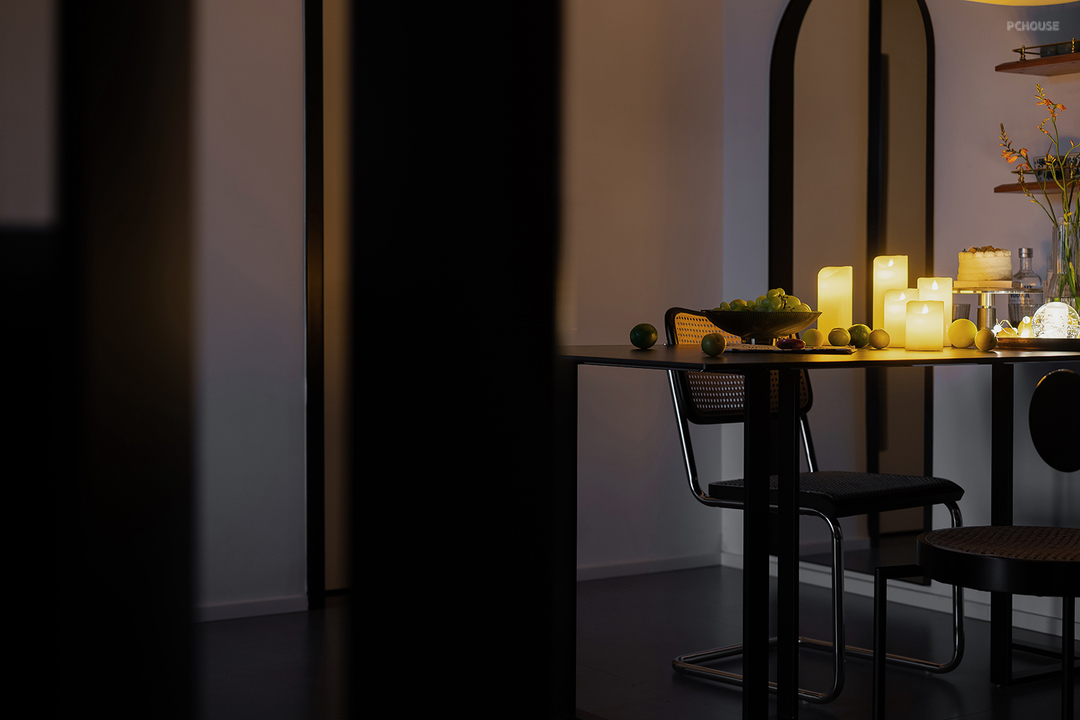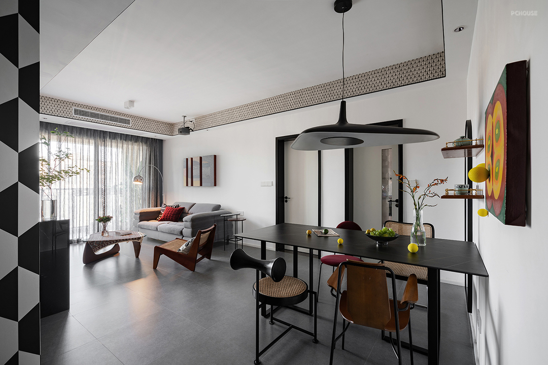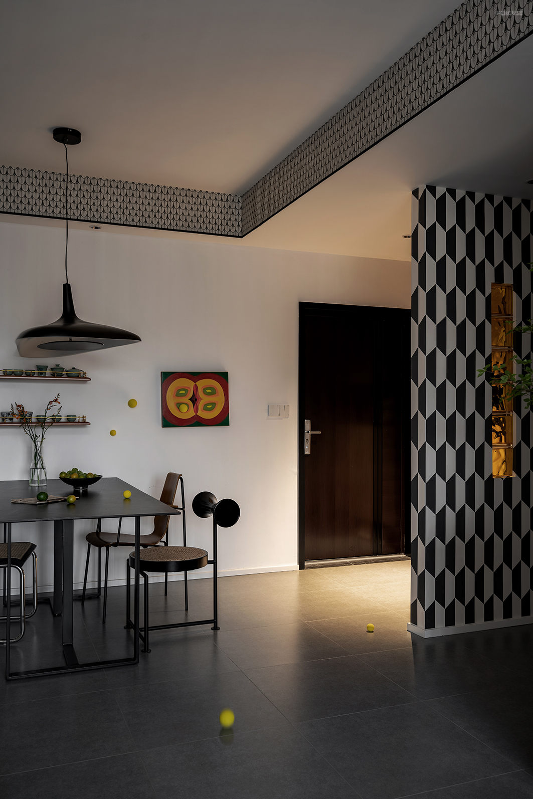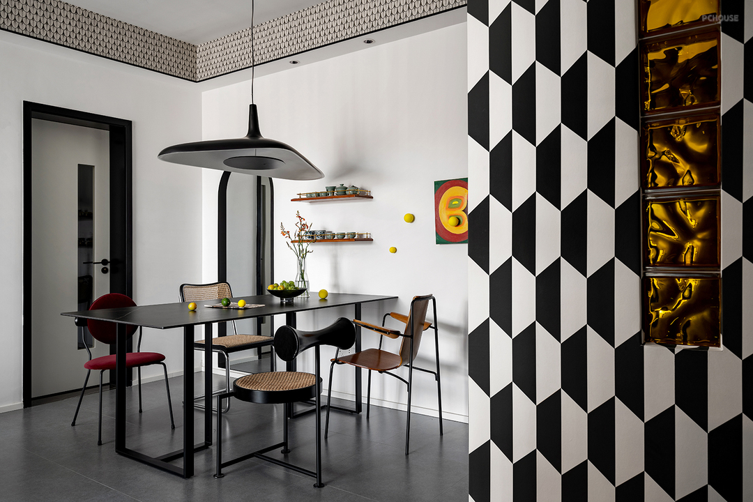 ▲黄色玻璃砖镶嵌六边形墙纸玄关墙,岩板餐桌搭配夸张的“UFO”吊灯,四把设计感的餐椅围坐两端。吊灯反射的均匀光线把整个桌面照亮。