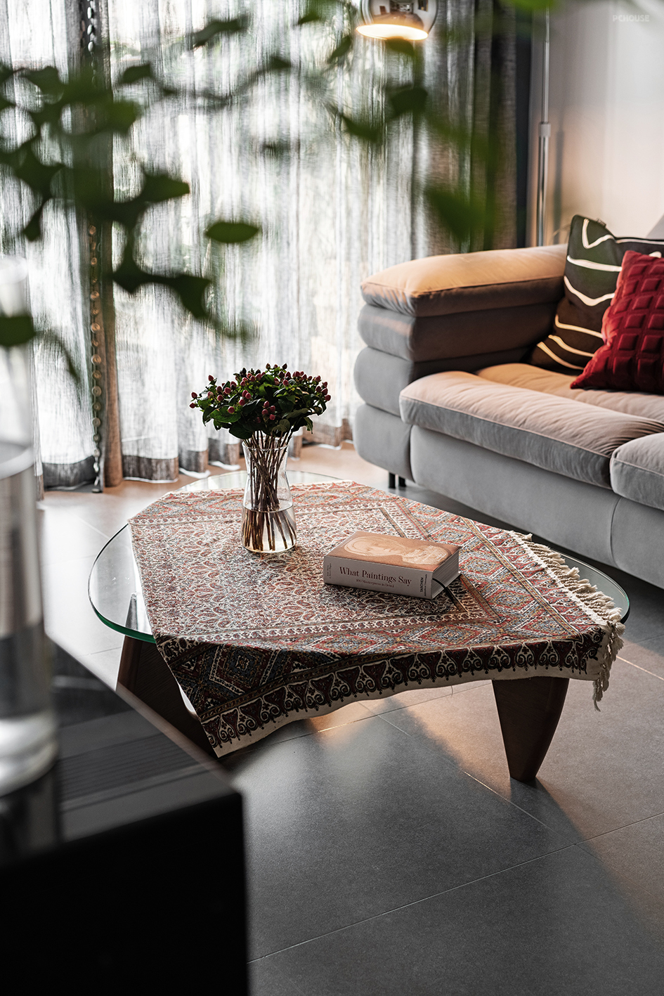 ▲大体量的羽绒沙发,搭配轻便的玻璃茶几,在满足使用需求同时,不至于拥堵,墙上搭配业主绘制的装饰挂画,别有一种复古调调。
