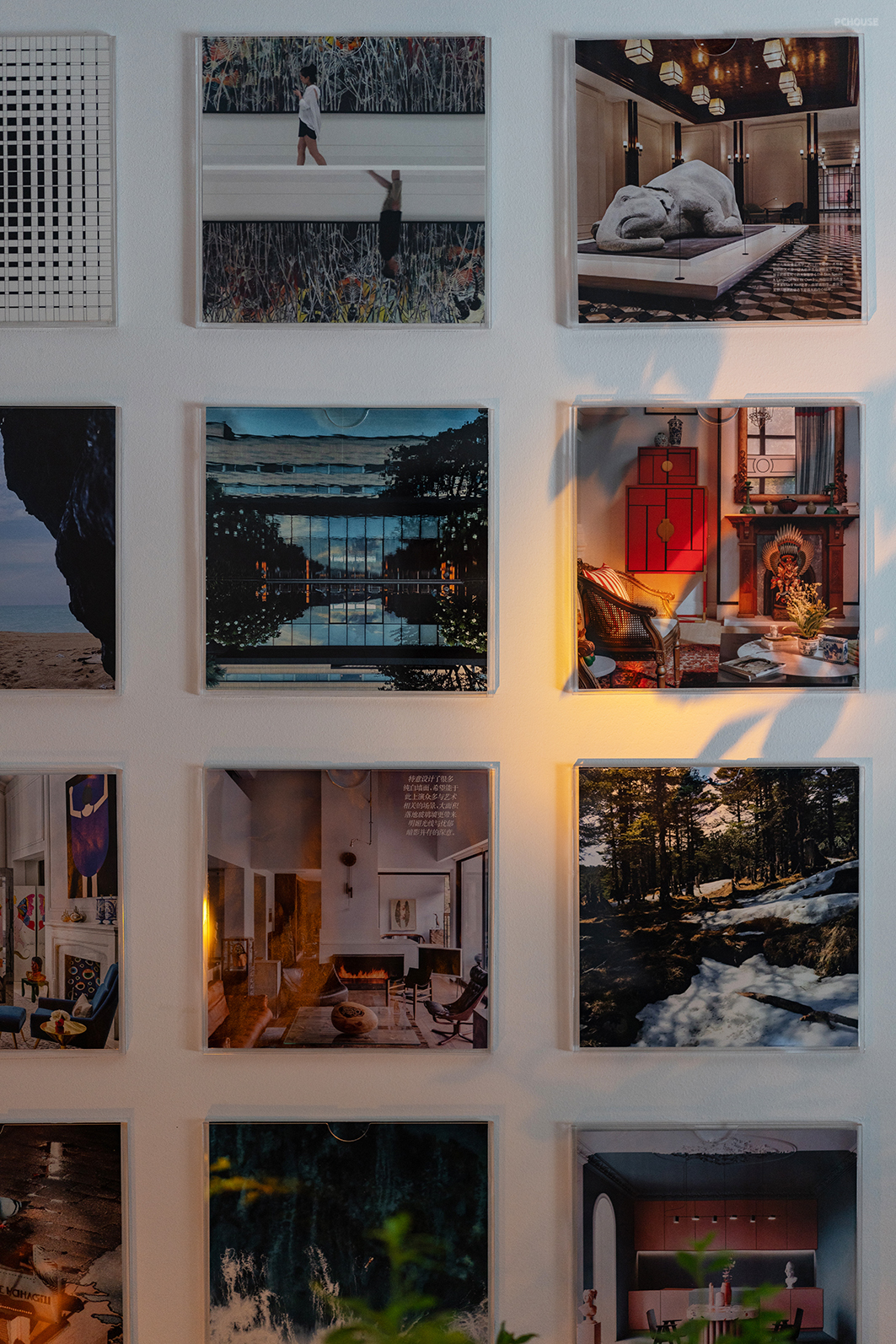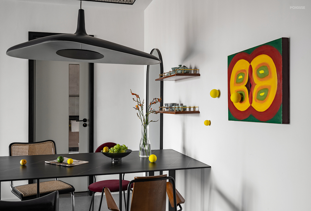 ▲餐桌靠墙,墙上固定装饰隔板,收纳有业主的茶具、酒杯,左边装饰镜与右侧挂画构成空间平衡。