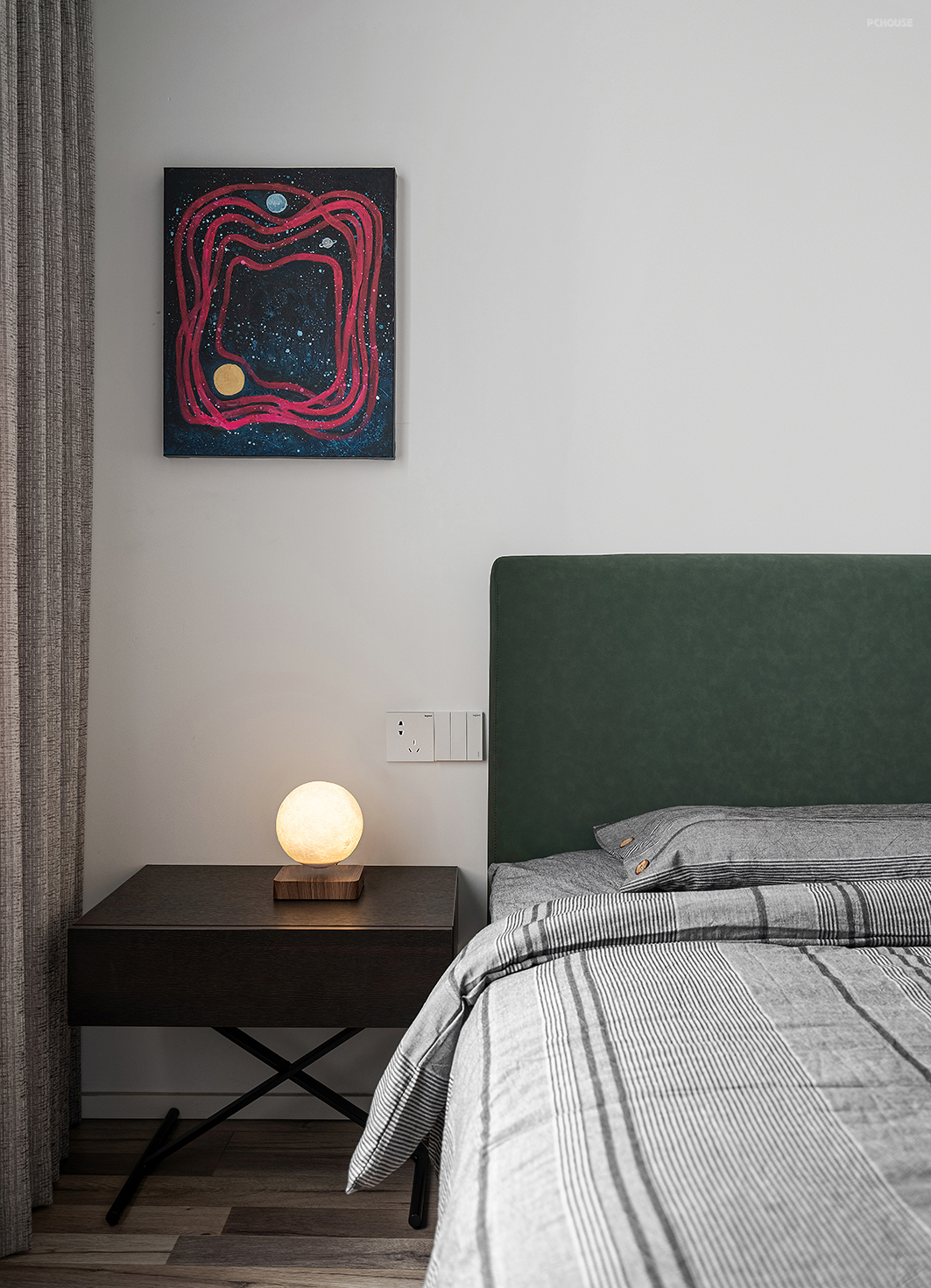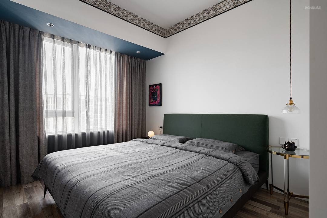 ▲主卧室延续窗边暗藏蓝色乳胶漆,顶上四周COLE&SON墙纸增添装饰感。挂画与吊灯一左一右保持空间平衡感。