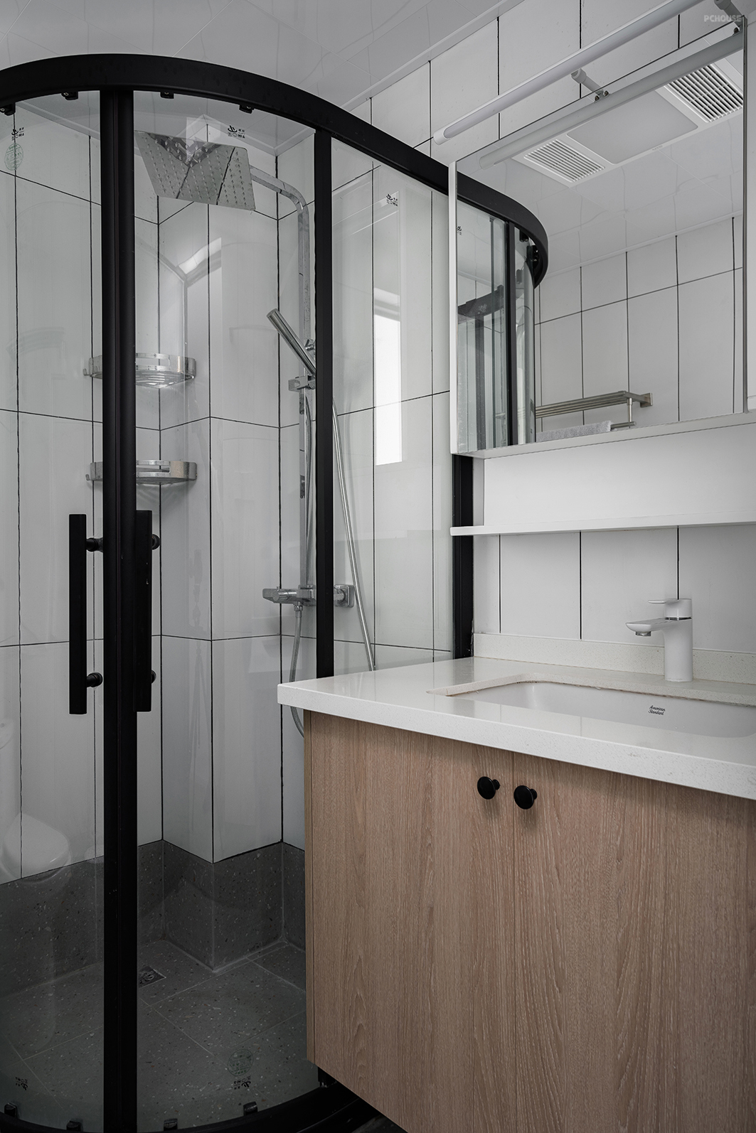 ▲白砖搭配仿水磨石砖,定制的木色洗手台,镜柜方便收纳。