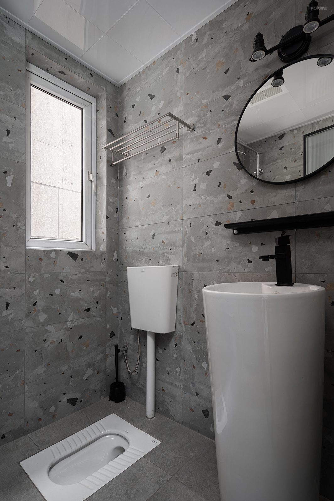 ▲仿水磨石墙砖搭配水泥地砖,独立柱状洗手盆搭配圆镜。次卫面积小,使用率不高,满足基本使用功能。