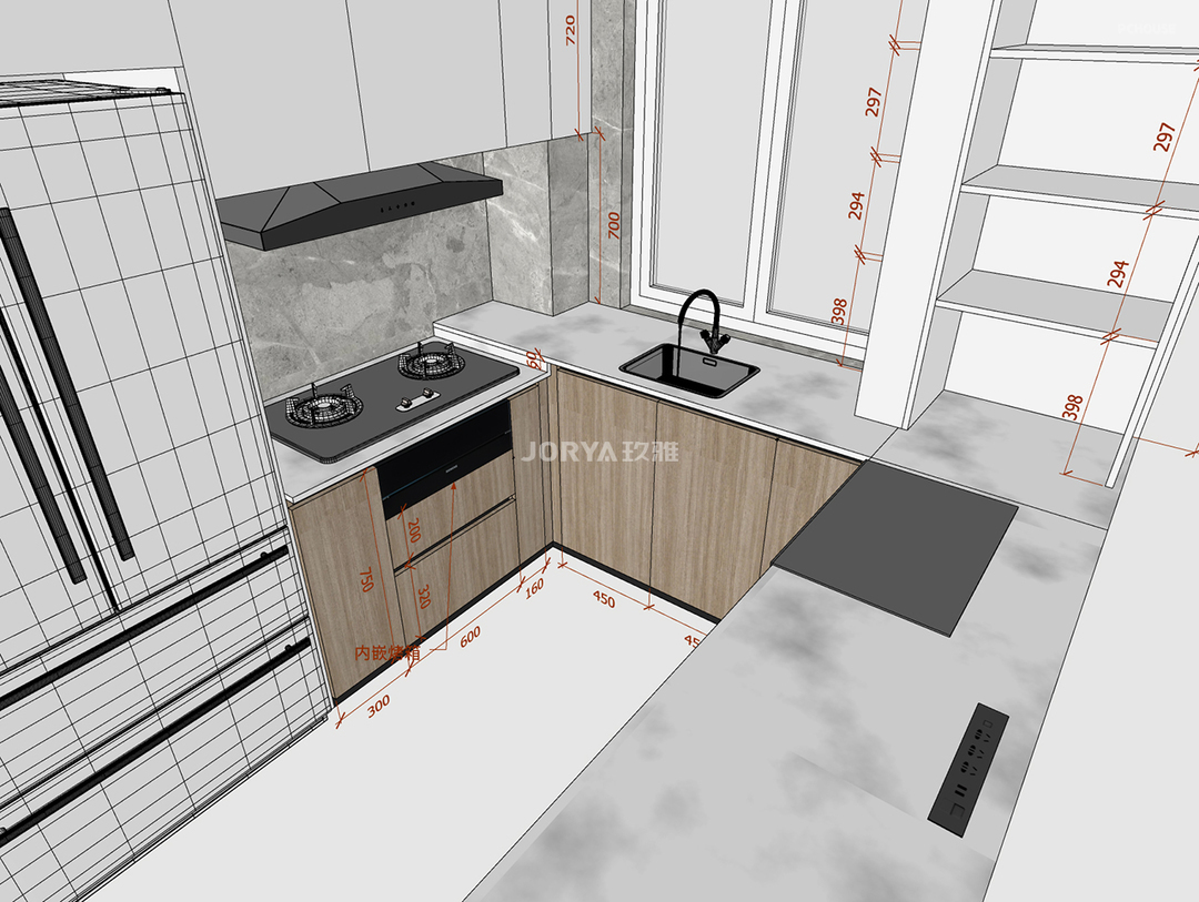 “U”字型的三边:一边是烹饪区;一边是洗菜区;一边是操作台+简单的早餐台。