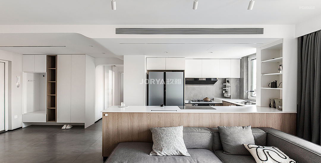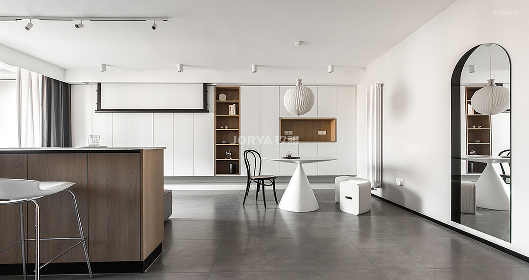 空间主色调是白色,点缀木色装饰,灰色半亮光地面让空间富有灵气。