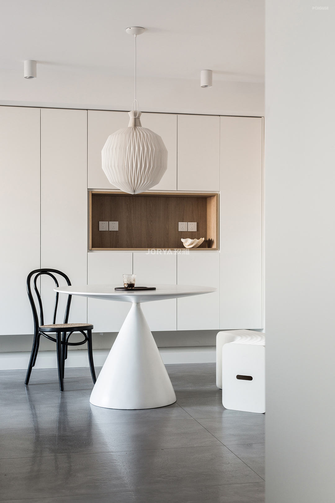 为了打破户型以及布局的方正,餐厅用了圆形和弧形元素的餐桌、餐椅(半圆形纸制凳)和灯具(折纸菠萝灯)。透过弧形门洞望过去,方与圆的对比,自然而醒目。