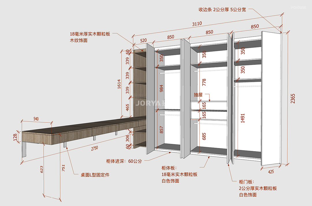 靠窗的位置由定制柜一边延伸出一长条书桌,满足2人轻松办公。