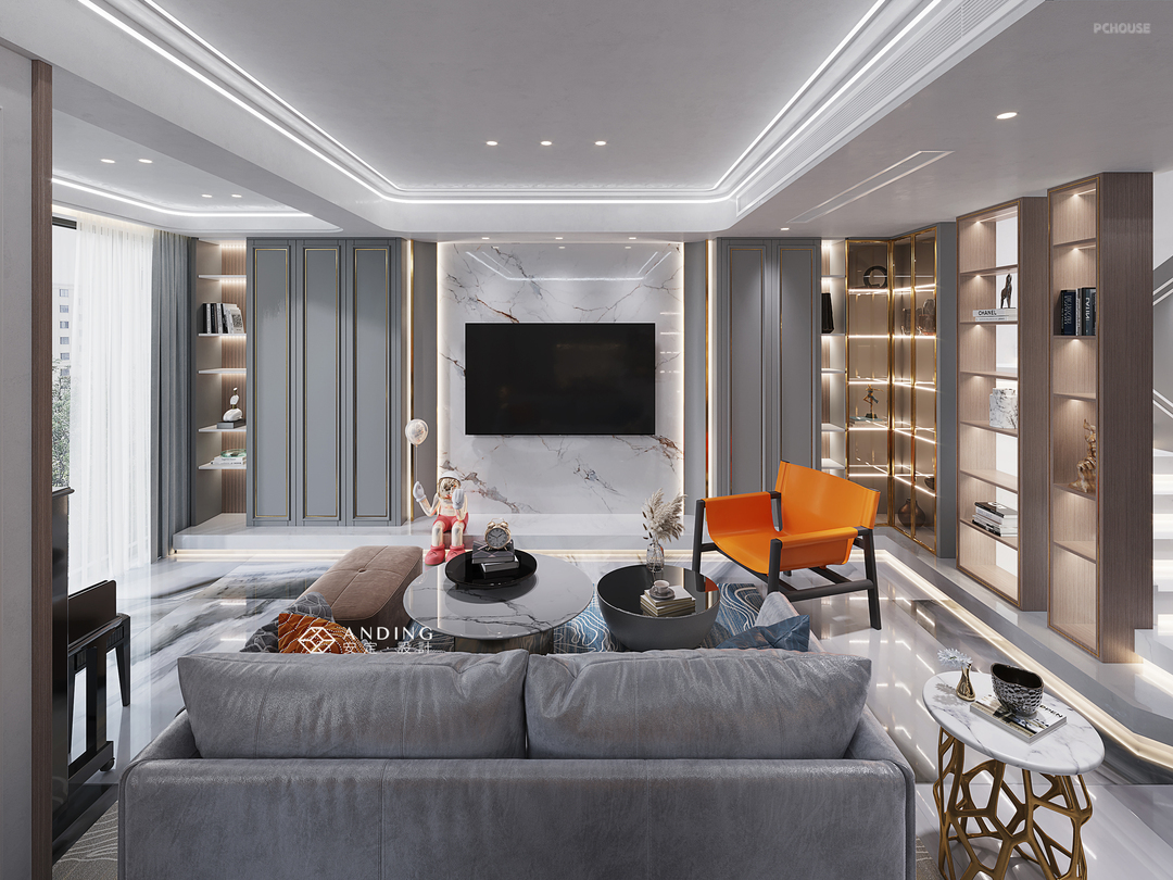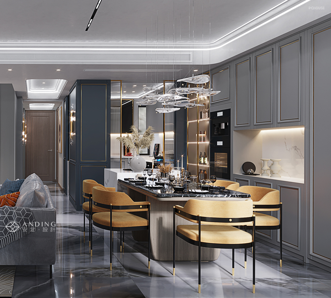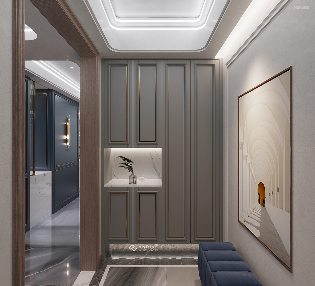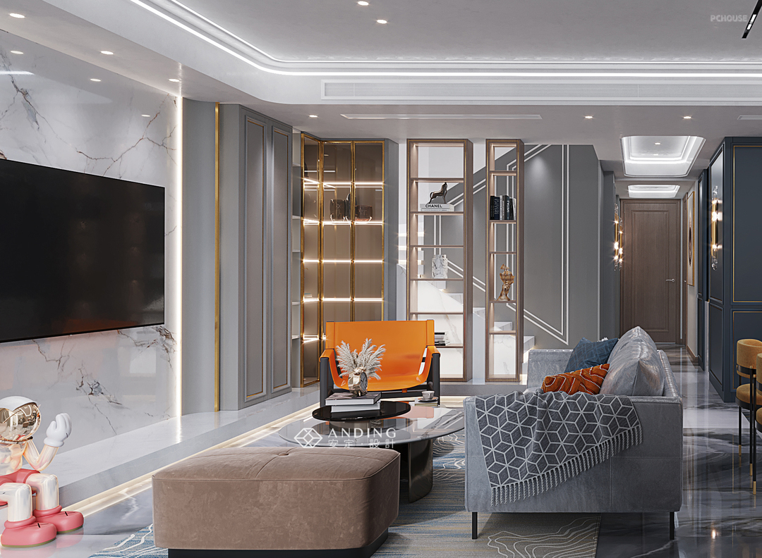 本案以现代美式轻奢出发,在充分展示空间的前提下,对材质、空间、色彩有着严格要求,将精心定制极具品味的艺术品融汇在沉稳大气的空间里,流露出精致尊贵的气质。