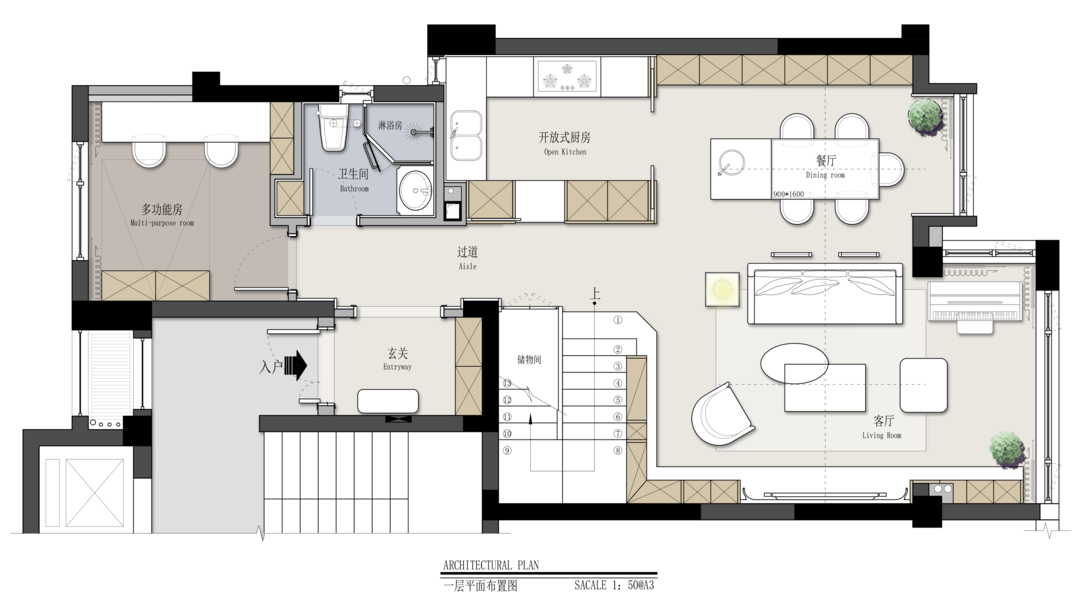 The design of the integrated guest-dining style is becoming more and more popular, which adds the space to the visual aspect. The camel-coloured dining chair looks more textured and matches the white circular chandelier above the table, creating a light and elegant ambience.