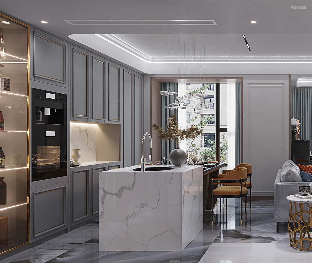 The entire wall of the kitchen is fully utilized. The powerful storage cabinet is embedded with kitchen appliances to release more area space and give people a flat and intuitive vision.