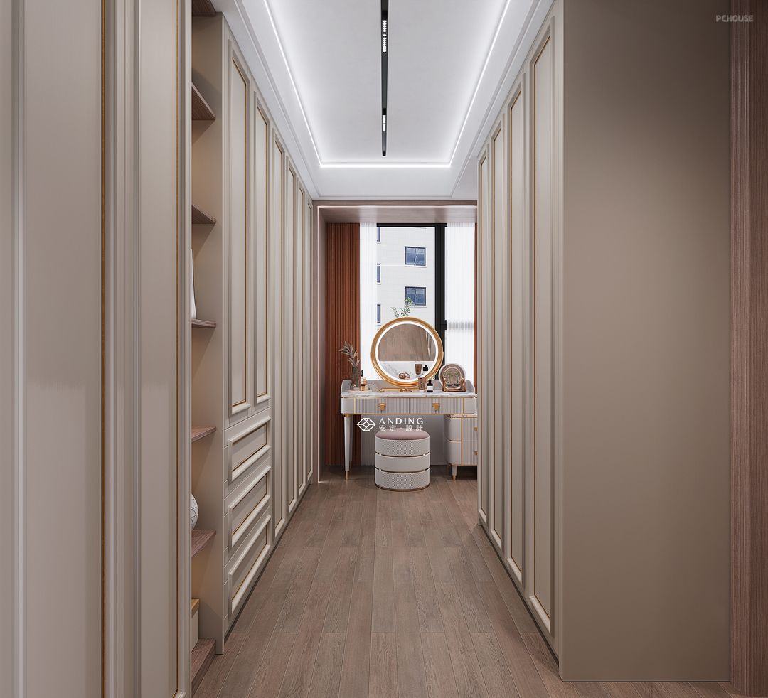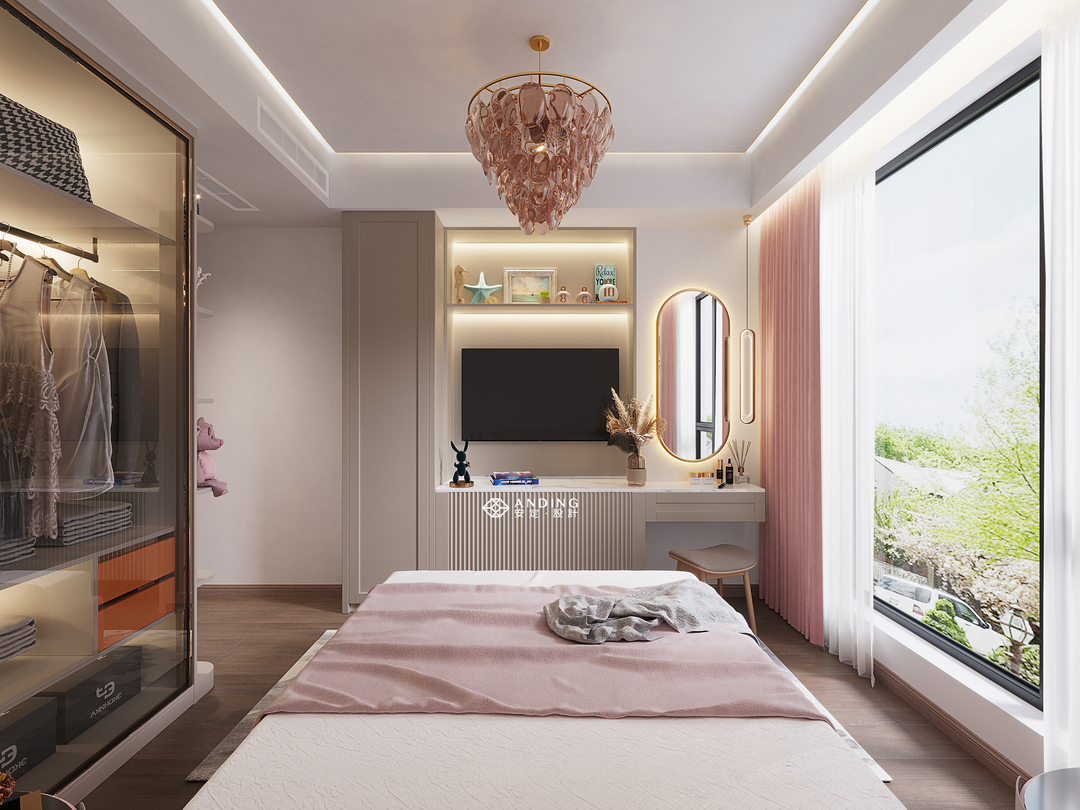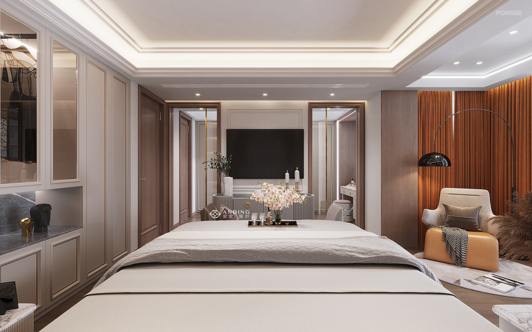 The bedroom continues the space clean and simple lines of vision and simple gray tone, clear and bright Texture Mirror, background wall part of brass underlay with paint solid wood Wainscot, in the details to enhance the delicate feeling.