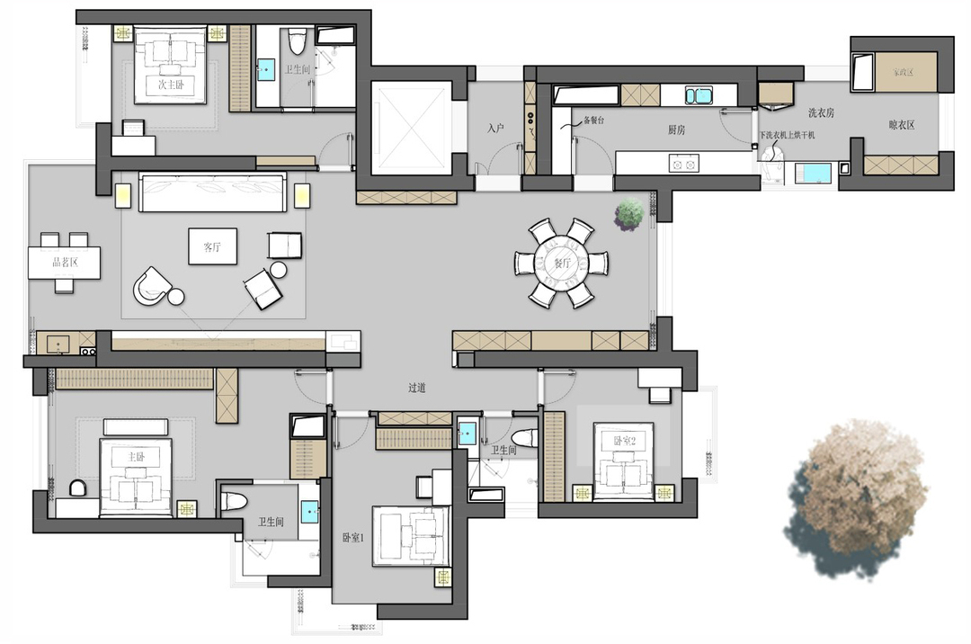 前言: 客户需求为空间色彩以米色、浅灰色、玫瑰金为装饰色,整体以米色为主色系。