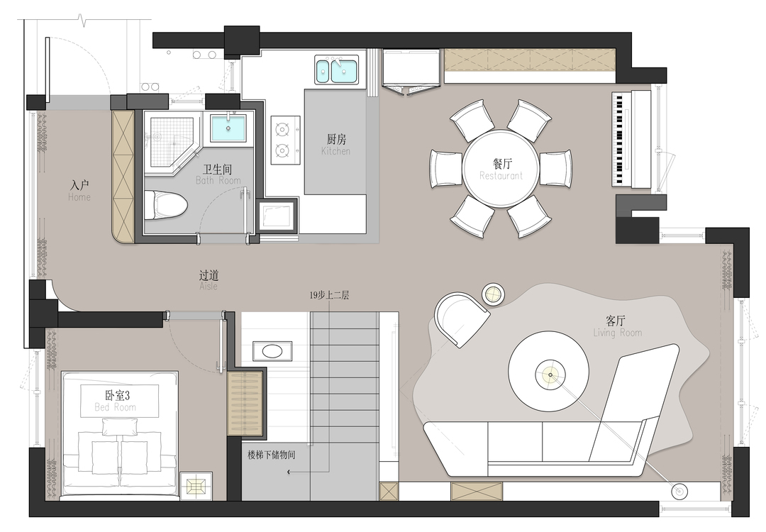 In the base color of the high-grade grey, the warm and moist wood elements construct the space rhythm of the balance of cold and warm. In addition, the use of the material and the tone highlights, when the light shines on the wall surface, it refracts the high-grade grey of different levels, so that the entire apartment texture and comfort are combined, while a sense of high-class.