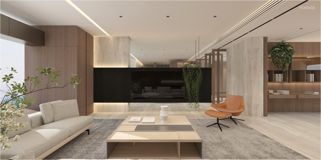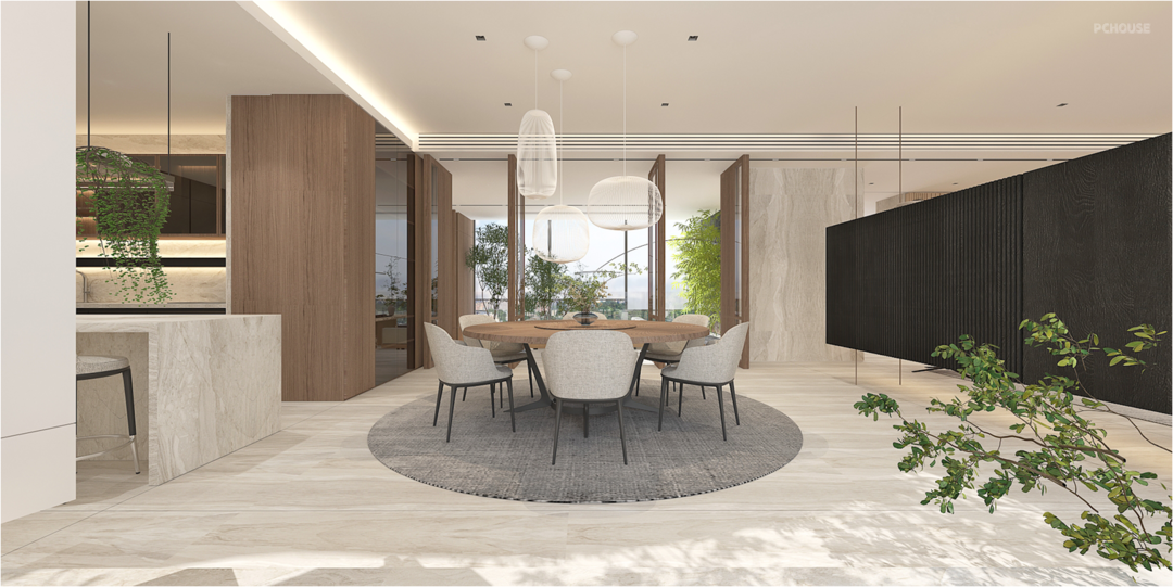 We try to maximized the interior views through physically linking he kitchen, dining room, living balcony, living room and study room, which also provide a potential of making the public life vivid and welcoming. Suspended TV backdrop volume also help provide more privacy to the living area.
