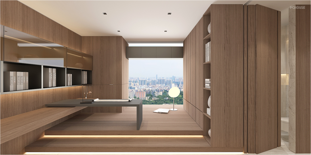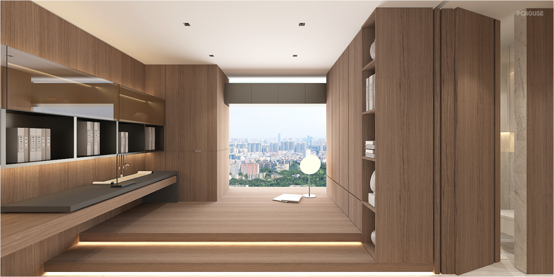 Studio might be the most deeply connected space for the occupants. The immersive walnut wood creates a calming atmosphere, and a pair of moving walls keeps the study from being isolated. When necessary, the study room can also become a complete and independent Tanami bedroom