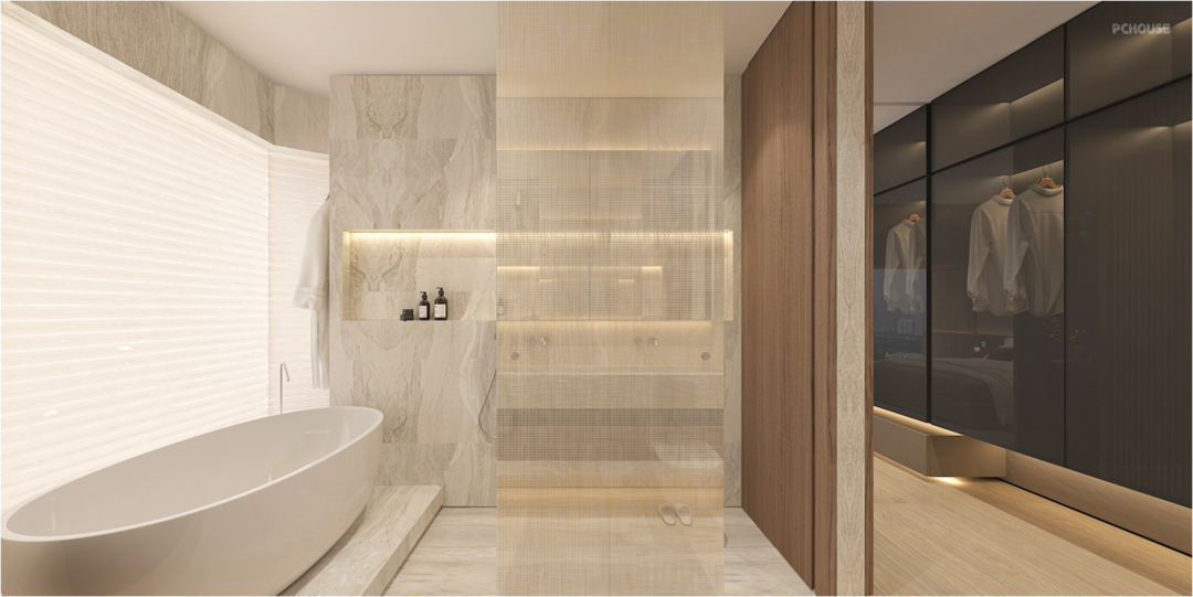 Bedroom could actually become warm and luxurious in terms of functions, through the design of separated wardrobe areas between different gender, as well as through having a relaxing and enjoyable bathroom.