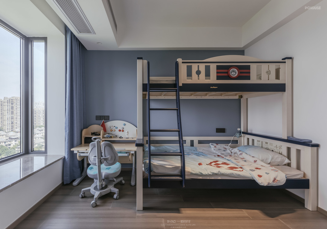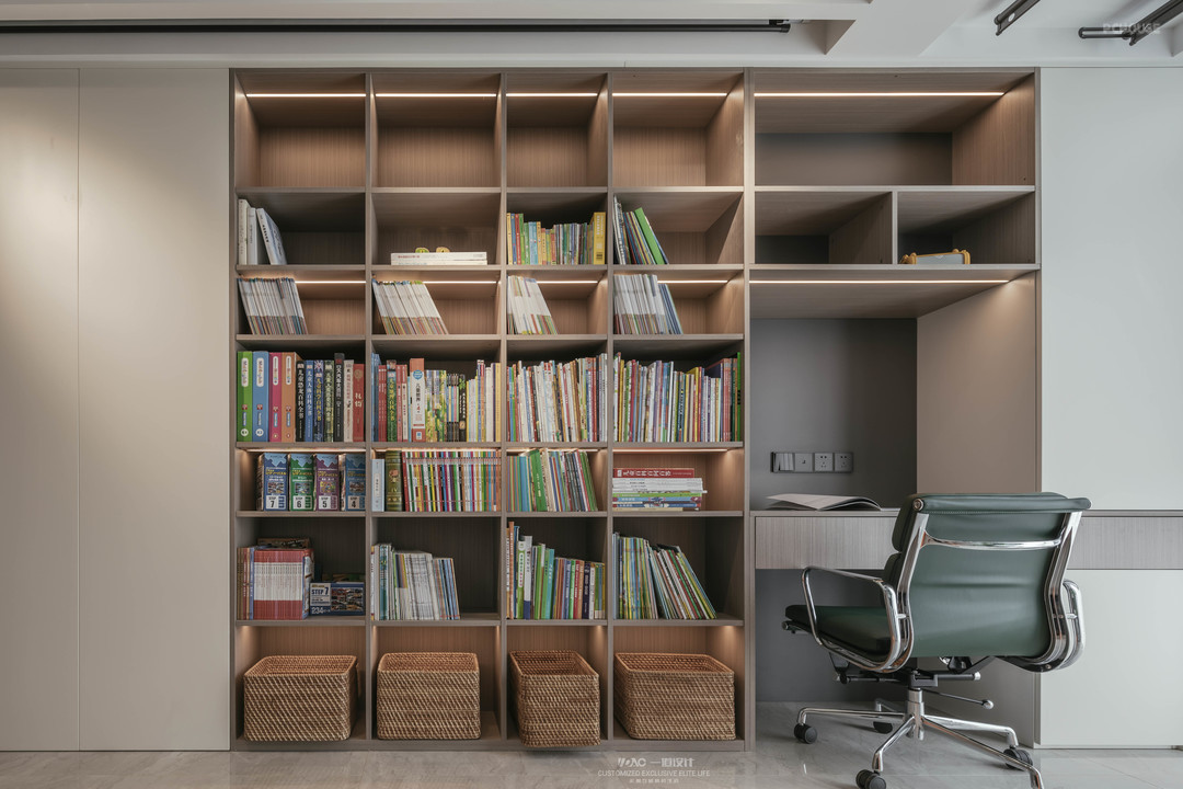 ●至顶木质书架在暖黄灯光的铺洒下尤为温暖,书架下方是孩子喜欢的书籍,上方是业主的刊物,随手可取,悠闲的午后,大人与小孩在这里一同阅读,彼此交流,共享书香。