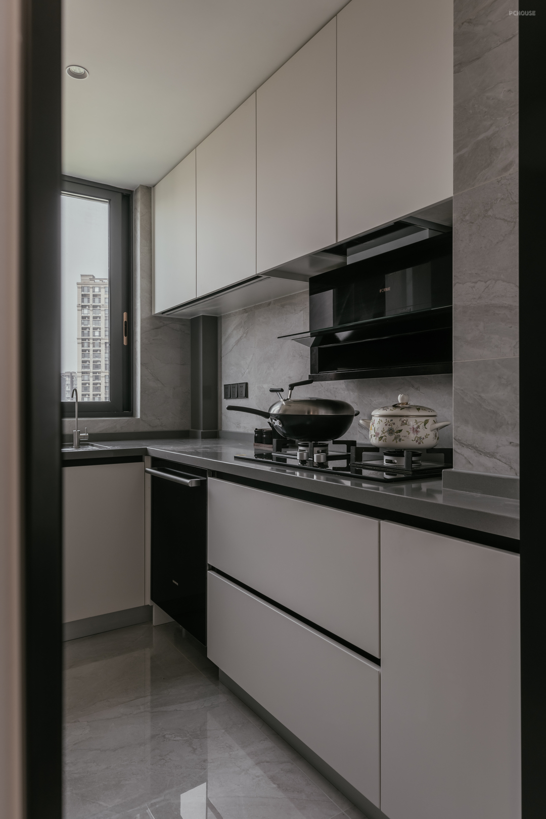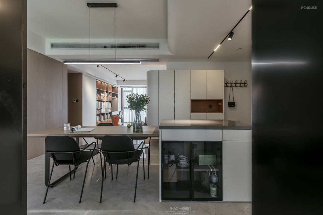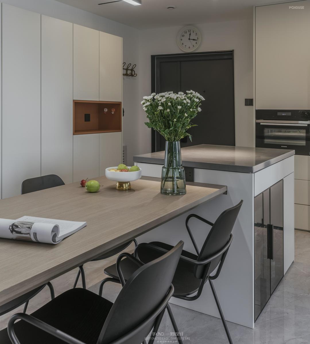 ●全开放式的餐厅空间开阔,功能得到了深度的挖掘。餐桌与岛台相结合,搭配电器柜和食品柜,弥补厨房的部分功能,并区分中西厨。