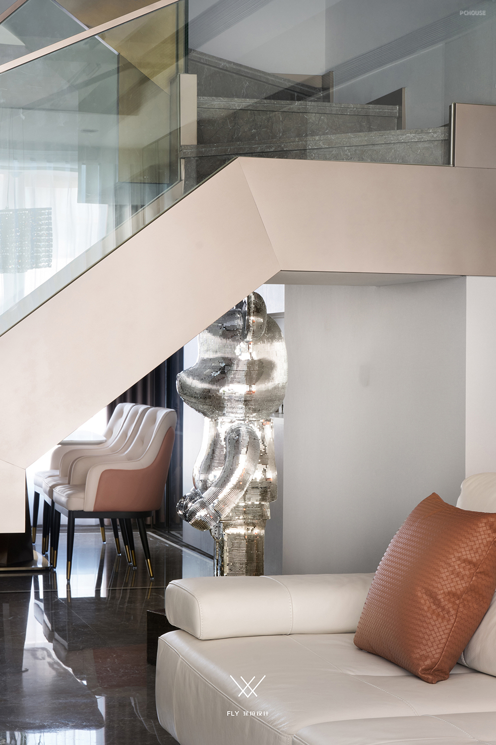 客厅看向餐厅角度,暴力熊手办放在楼梯下方的位置,一石三鸟同时装饰着楼梯、客厅、餐厅这三个区域。
