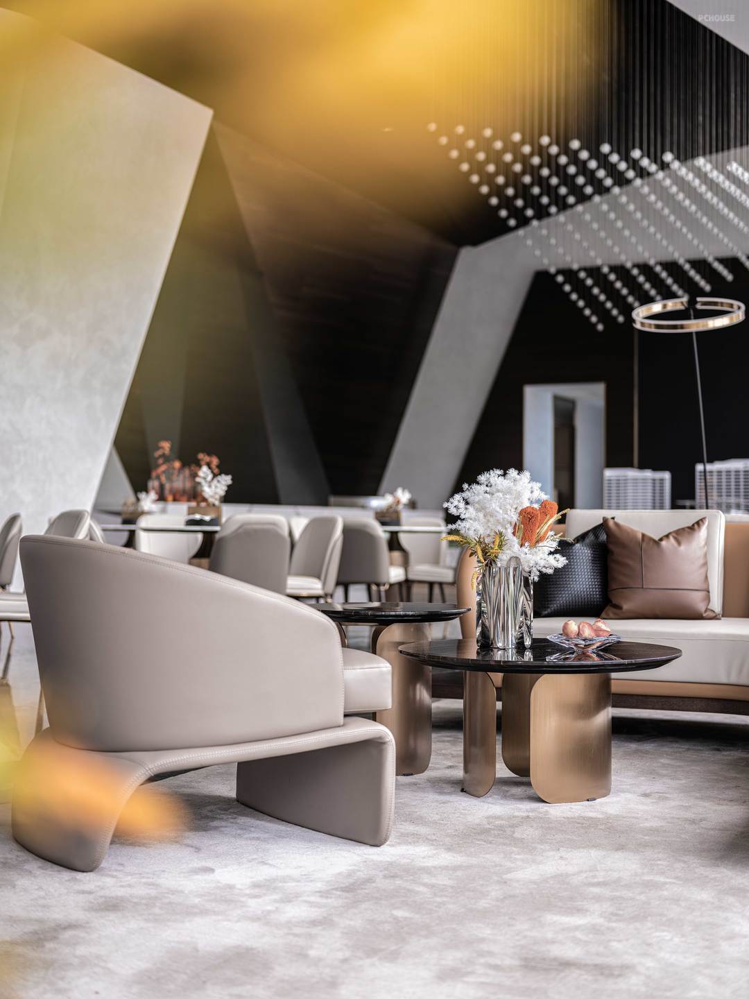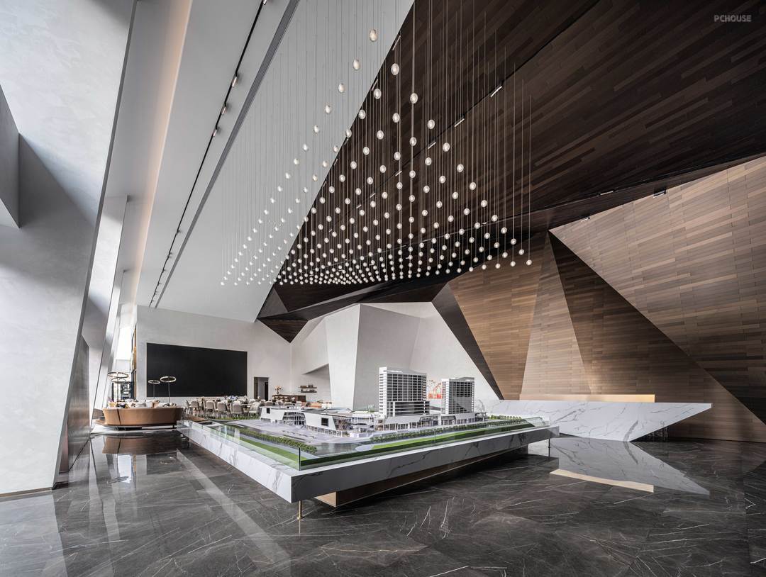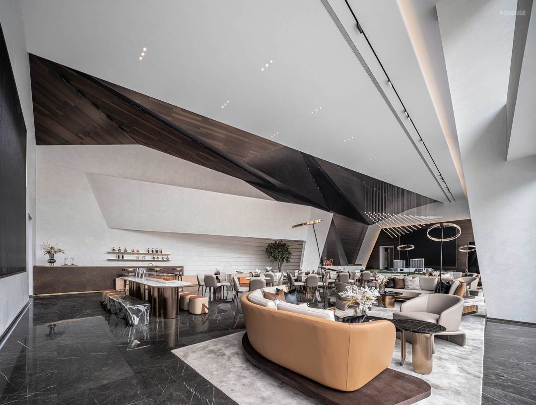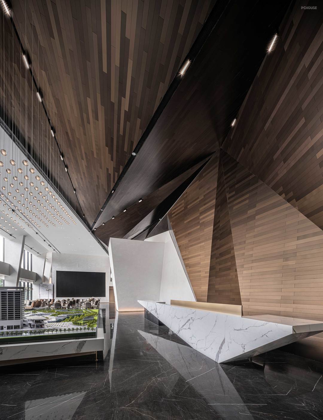 接待大厅以镜面不锈钢与几何金属防火板的碰撞融合,构成空间的多维度群山造型呈现。沉稳的大理石在广博的纹理中,嵌入黑金渐变的色调,婉若天空微亮前的山峦金顶,使观者置身其中,产生对历史记忆的共鸣。