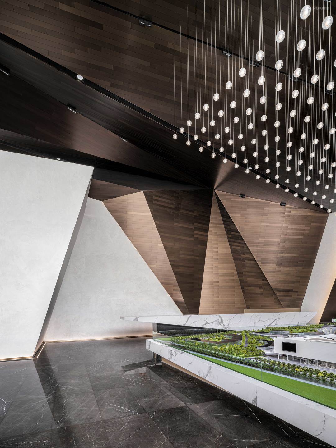 模型区以充满秩序感的粒状吊顶引入光线,鳞次栉比又连绵起伏,如山脉上的浩瀚星辰,从中漫射的光影让空间视野极具延展力。