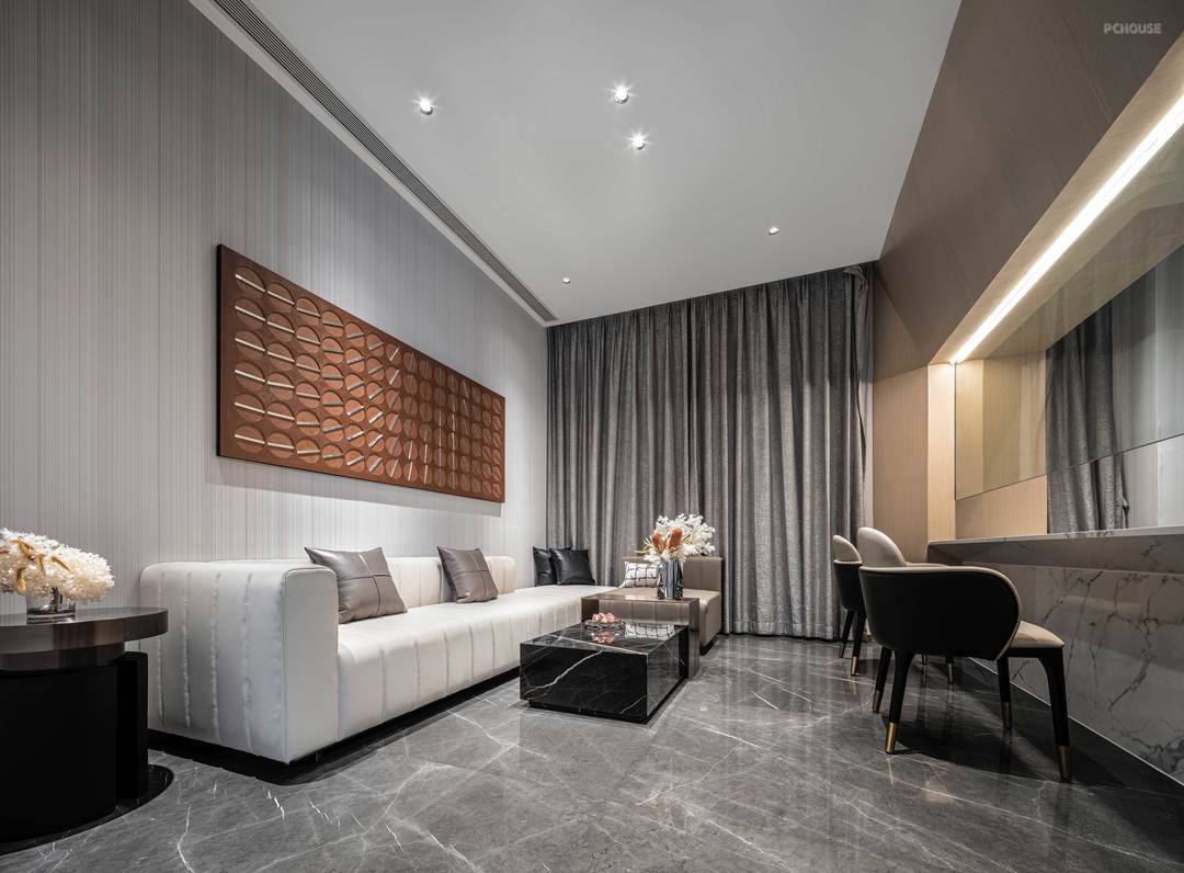 洽谈区以山谷地形为基础,解构地貌肌理层次,融会诗意化艺术细节和穿透关系的视觉光影,交织出一个简洁纯粹的会客交谈空间。