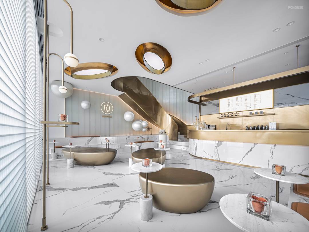 设计取自于“太行灵秀,漳河浩荡”氛围渲染,设计师把太行山秋日金黄的色调萦绕整个空间,麦垛状的极简餐椅安置在黑白纹理的瓷砖上,以梦幻泡泡装置与人们交互,形成舒适和谐的视觉效果。