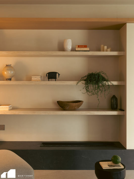 台湾风格,我们定位相对干净、简单、留白多一点。电视背景大面做了一个层次,减掉电视柜功能,所以东西都放在地台上面。做了一个背景又看起来比较简单。看电视设备都可以放在地台上面。