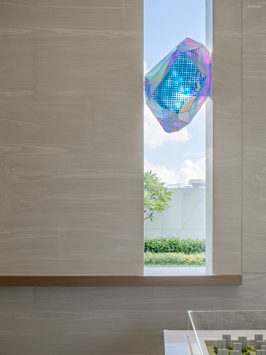 在解构的空间中,适宜的墙体镂空处理,安放如蚕蛹般的霞光溢彩辉映半空,似乎静默一场新生,展现蝴蝶以破茧而出的力量。