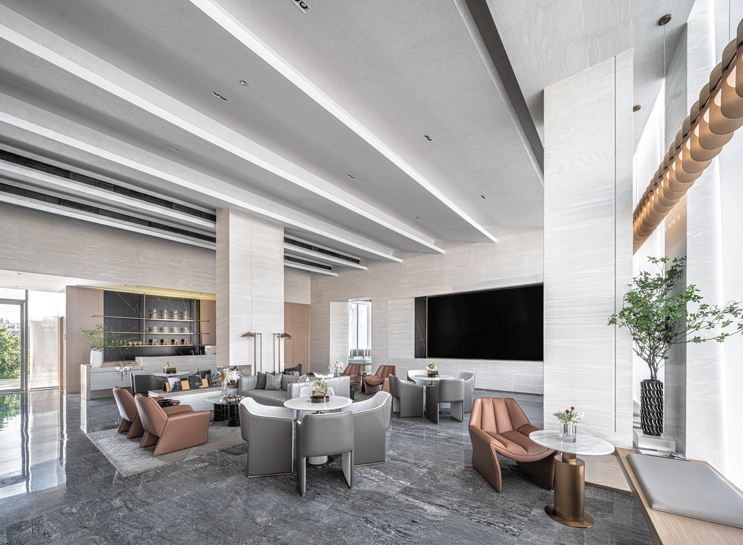 如何快速达成洽谈空间的理想社交距离的设定,设计师延展了空间视觉、动线的串联,在极简光影中,探寻人与自然和谐共处的边界,实现人、自然、光三重情感的呼应。