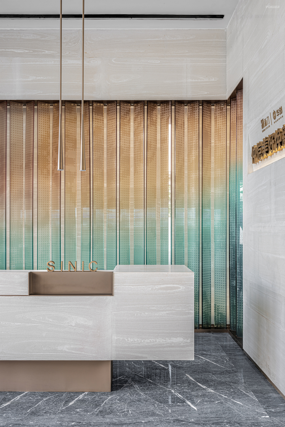 走进接待大厅,秉着定制化记忆符号带来强烈的感官体验,将设计的想象力通过科技带入到未来的生活憧憬当中。借用蝴蝶双翼幻化为造型屏风,以蓝橙渐变色彩为媒介,似乎打破沉静的场域氛围,暗喻着这城市如旭日初生的般美好。
