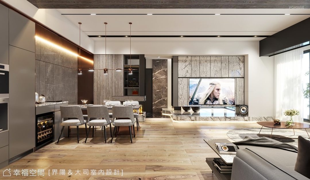 餐厅主墙拼接大小不一石材,谱出流动节奏,并适切镶上光亮镀钛质材、灯带,将用餐时的温馨情景框画起来,织就最美日常家景。紧挨着墙面的小型中岛,植入小型红酒柜与IH炉,以便屋主随取珍藏红酒品啜、烹煮热腾腾火锅,享受惬意慢时光。后方开放式厨房所占面积虽然不大,仍配备厨具、电器柜、附水槽中岛吧台、吊架等周全设备,满足烹饪所需,亦于厨房侧边与吧台上方订制轻透玻璃拉门,限制油烟溢流,确保空气清新无污染。