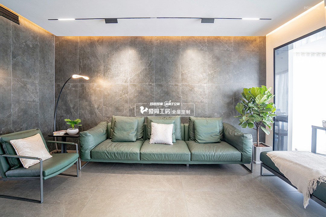 客厅格局明朗,整墙电视柜选用西班牙云石板·钛金灰将展示空间呈现出最大化效果,不惹眼,不浮夸,却将“奢”发挥得令人舒适。绿色沙发作为空间的跳跃色彩,与青葱绿植相映衬,带来了别样的舒适感。