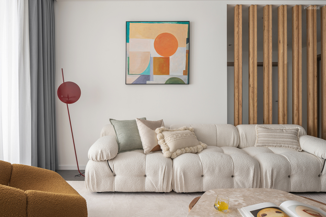 ▲客厅采用无主灯设计。用不同纵向高度、不同光源类型的灯光,丰富了空间层次。客厅软体的沙发让屋主慵懒的躺在这里交流互动、打游戏。