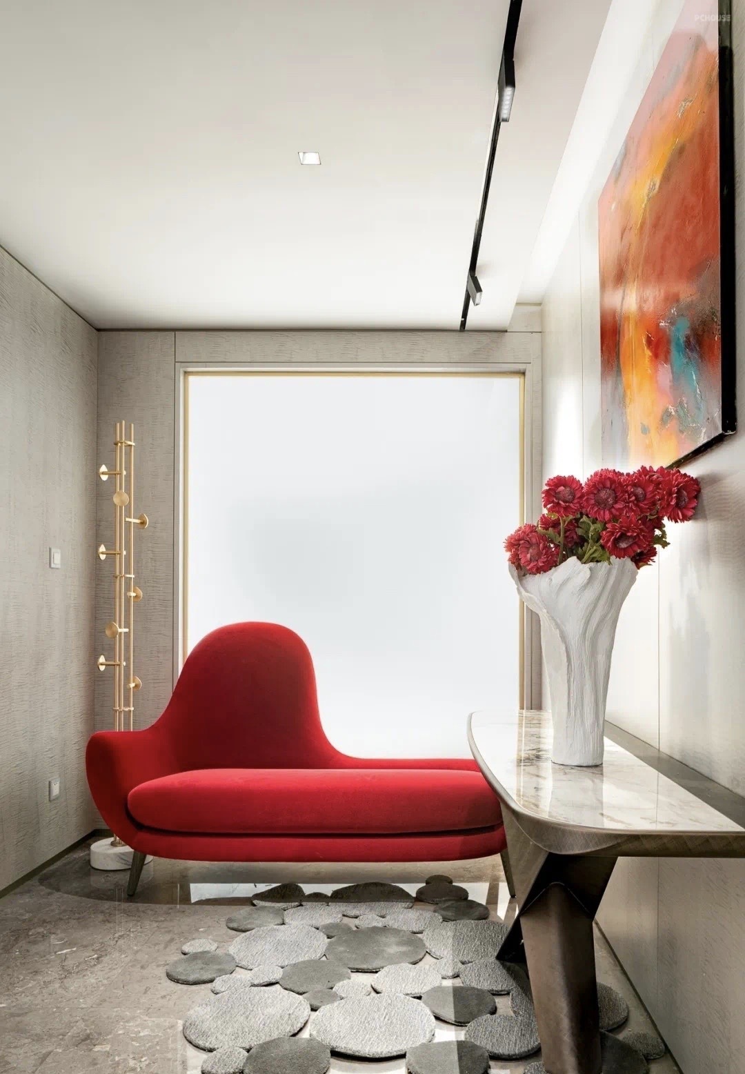 进门的玄关,是大理石的瓷砖和零星不规划的地毯装饰,不仅看上去简单大气,而且充满了现代时尚风,使这一个小小的空间层次感更加丰富。Cattelan的玄关台和Poliform的卡地亚红沙发形成进门的视觉亮点。大面积采用通电雾化玻璃,充分利用自然光源,使空间更加明亮整洁。吊顶的洗墙灯突出了玄关主背影的质感,墙面通体采用影木材质。
