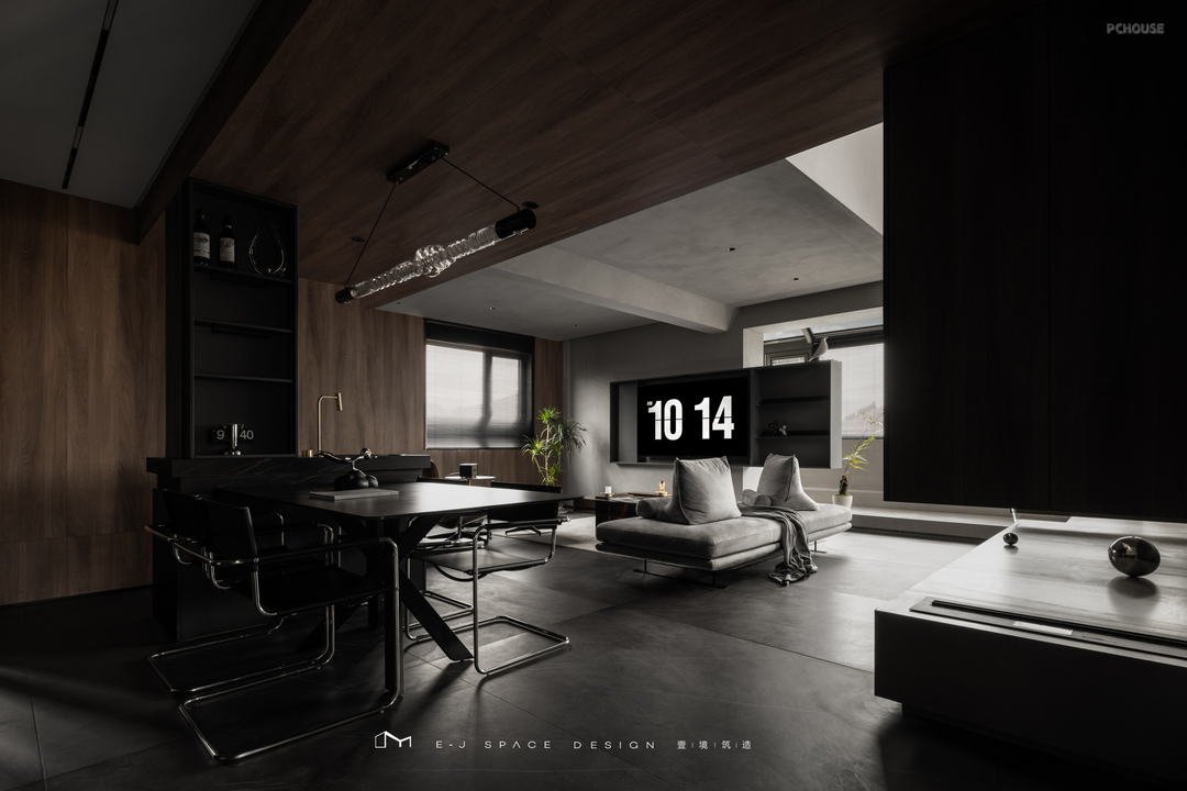 以暗调氛围贯穿居室,柔和木色与浅灰色系的结合。