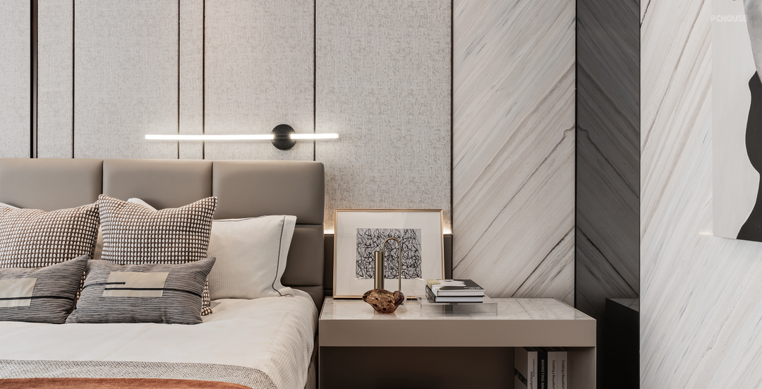 将精致品质连贯至主卧,此处延续客厅大环境中的高级灰与材质细节。线条与质感的双重跳跃下,主卧空间促成和谐共奏,安放着日间紧张节奏后的睡眠,消融压力释放疲劳。