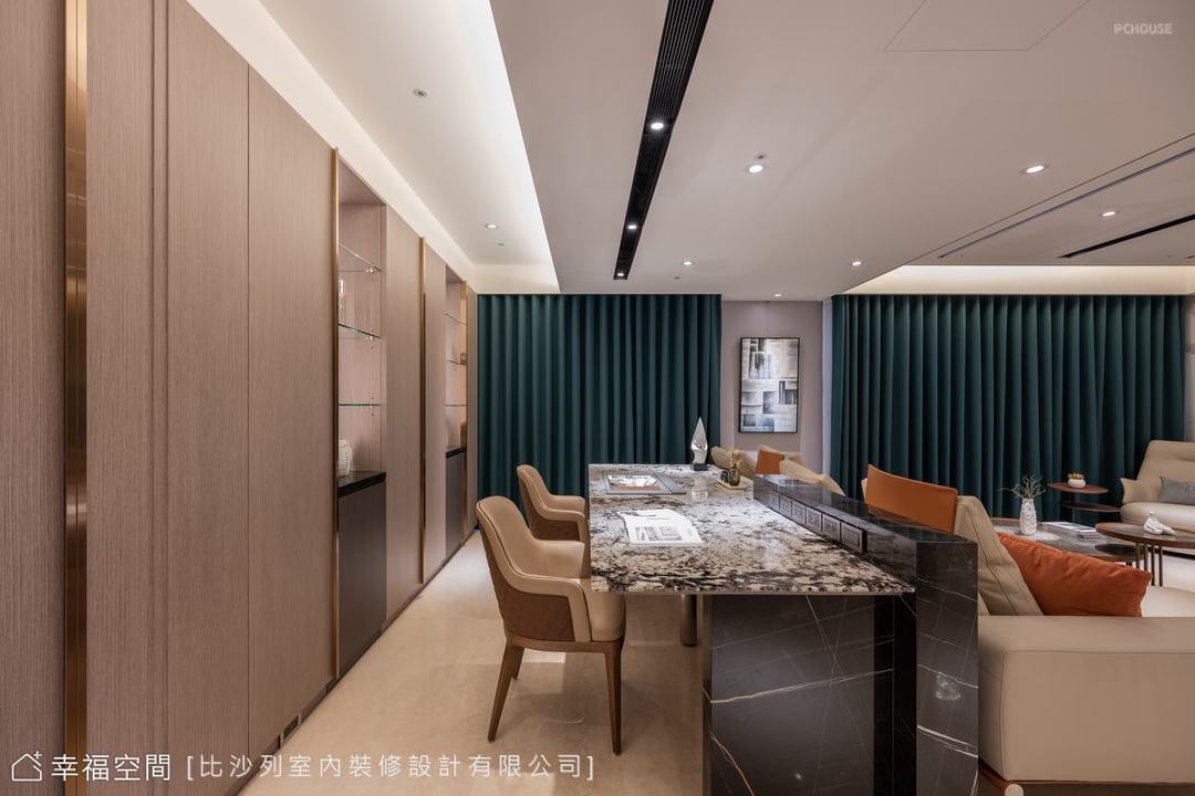 客厅后方的开放式书桌,则选用带有共生水晶的花岗石材铺排台面,搭配圣罗兰黑金桌角和短屏风营造暖色调跳色效果,同时也将书桌所需要使用的灯座、插座等配线收至短屏风,而圣罗兰黑金深色馀料也善用在餐厅、书房后方,型塑有条不紊的视觉感。