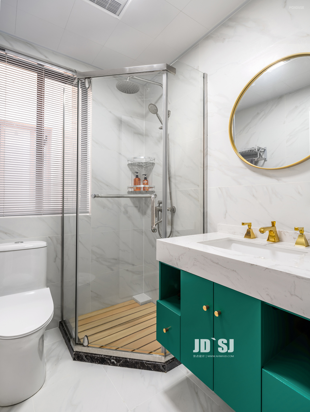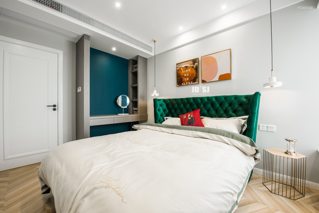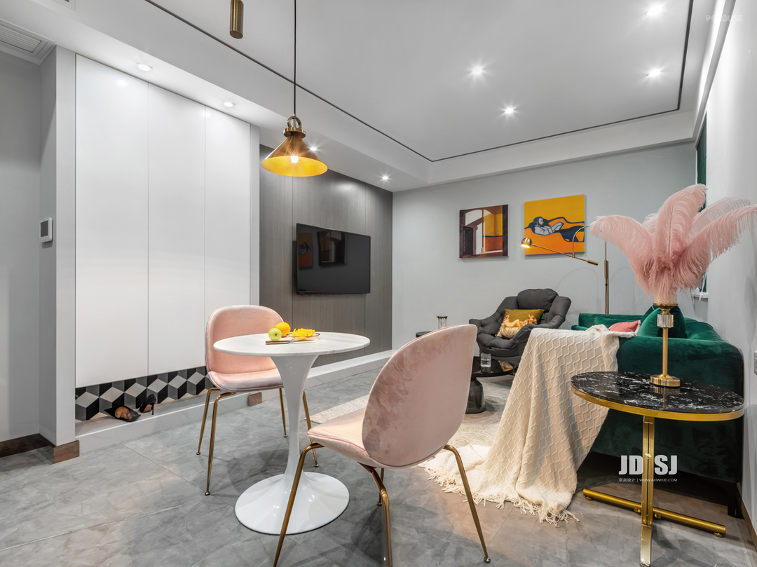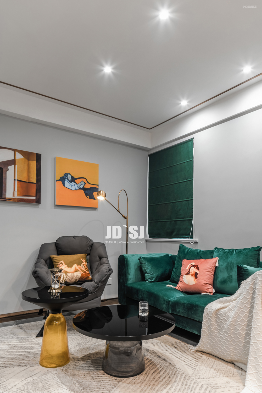 前言: 项目位于芜湖城东市政府旁的小两居,业主偶尔去住,所以对厨房、餐厅以及阳台的功能性不做要求,放弃了次卧改为客厅、增大餐厅面积并且把冰箱从厨房移出来的设计方案。本案摒弃小空间常用的北欧风格,以墨绿色与灰色构成强烈对比,通过香槟金的搭配,渲染上一层精致格调。全屋采用无主灯设计,以点光源、线光源烘托居室氛围。