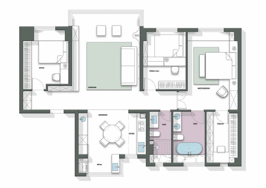 3、将原有户型的小房间和主卫重新进行面积规划调整,原有主卫位置变成衣帽间,小房间变成主卫。改后的空间动线合理,也解决了主卫位置尴尬的问题。