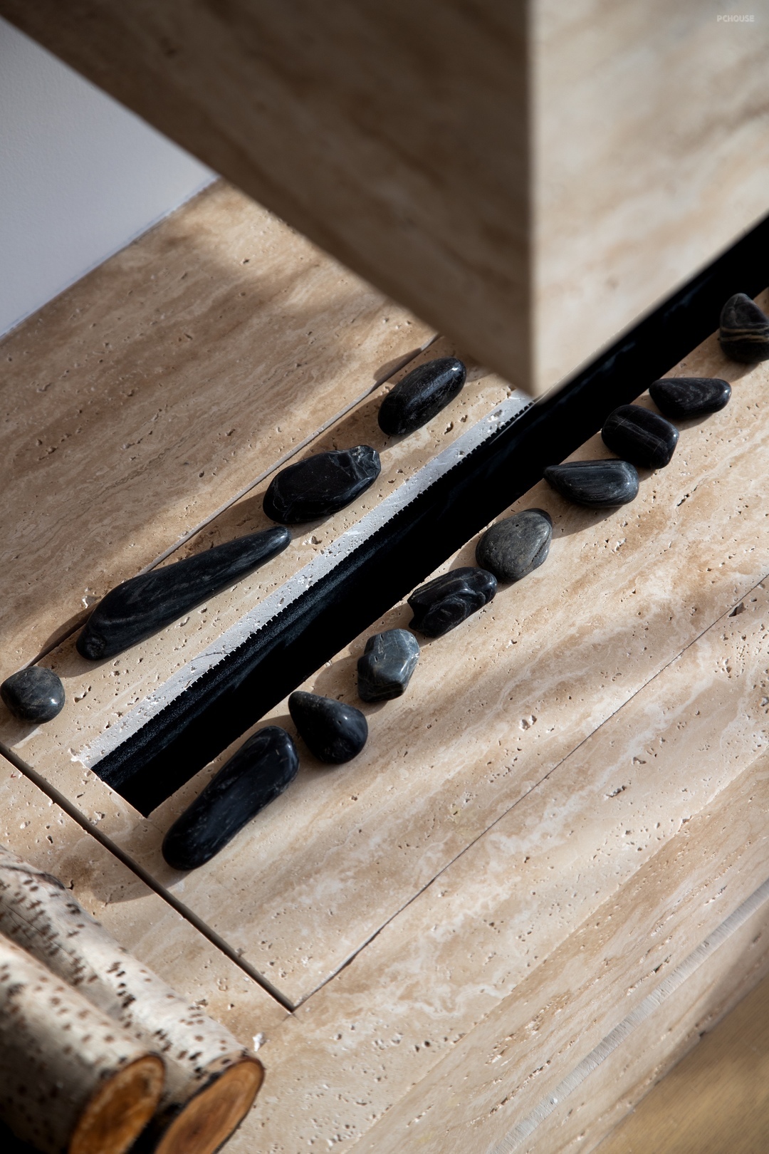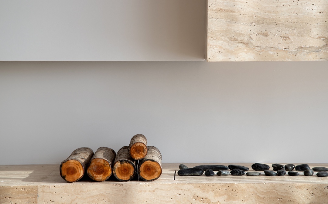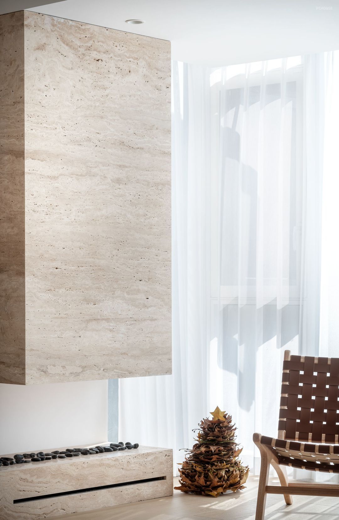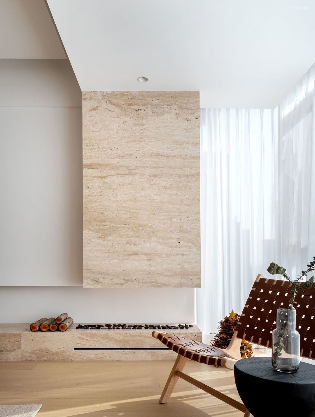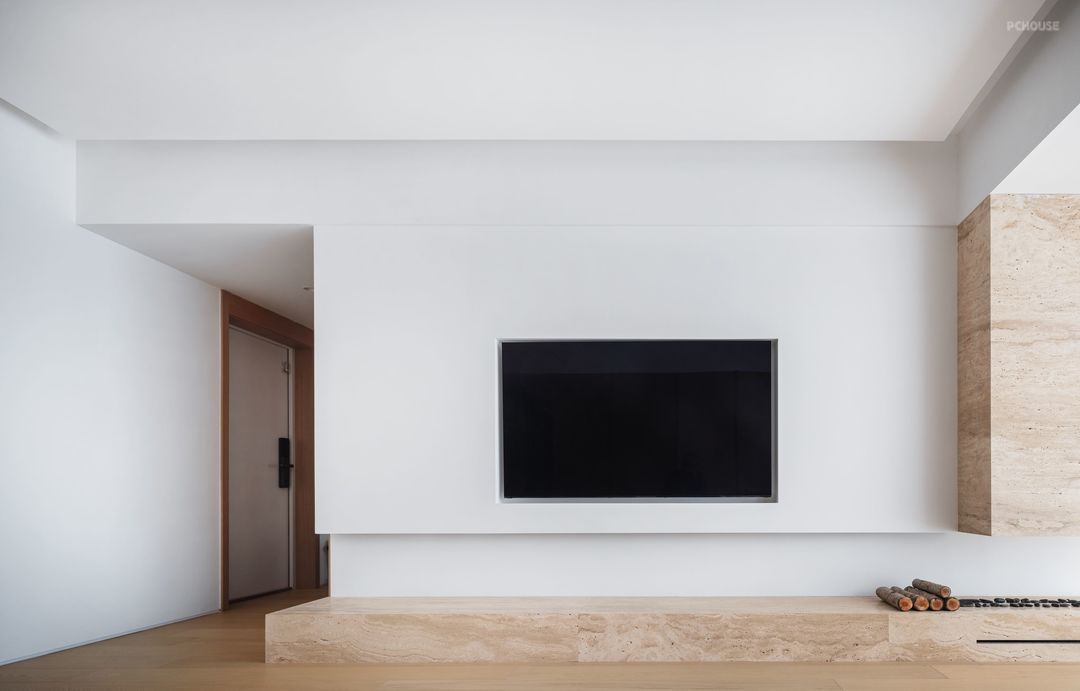 极简电视背景墙设计,采用纯白色墙面将电视机内嵌,墙面选择用肌理质感丰富的白色艺术涂料通刷,让空间看起来更干净简洁,为避免过于单调的造型,又在靠落地窗的一侧做了洞石岩板突出造型和壁炉设计,为颜值加分。