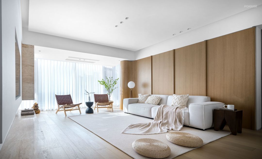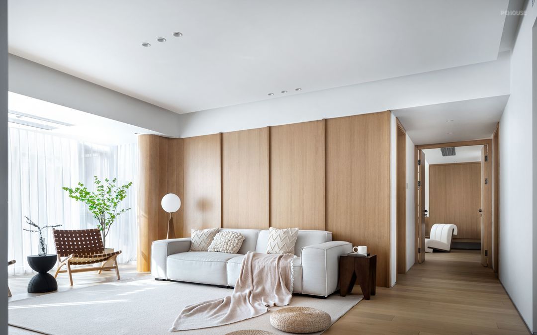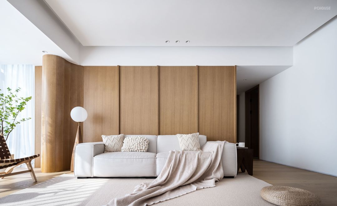 原户型的一大缺点是空间层高低,所以采用无主灯设计,让顶部大面积留白,视觉上拉升空间层高,让空间更加立体。沙发立面增加木色护板墙,为空间增加了丰富的光影效果,也赋予了空间素净的暖意。