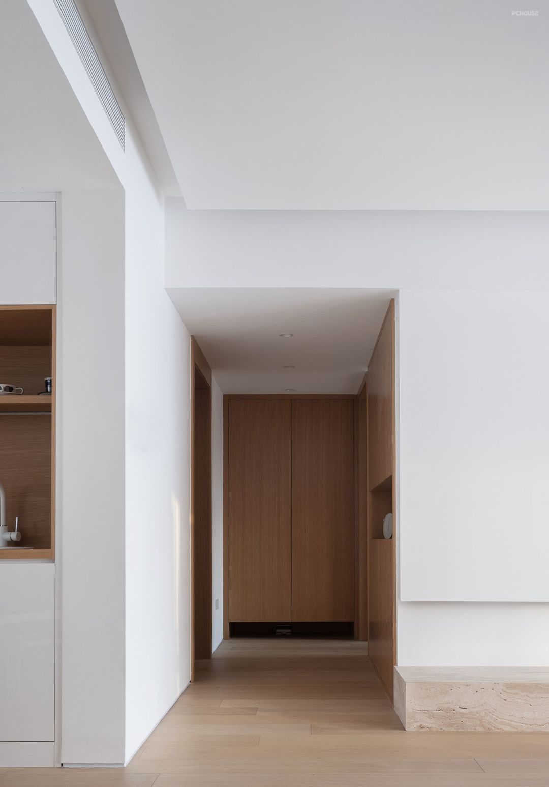 玄关设计十分简洁。原户型玄关空间比较宽,最佳的设计方案就是做一组与强平行的鞋柜,鞋柜玄关一体化,既有储藏也做玄关,通顶式收纳柜收纳空间大且无卫生死角,玄关柜中间留空,方便放进门随身的包包和钥匙。